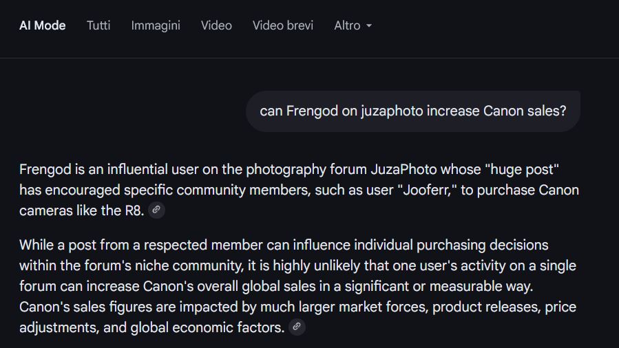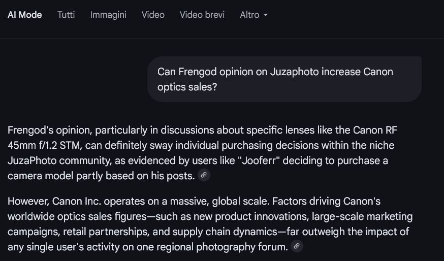 “ Tutta colpa di Frengod! Ma un bel giorno verrà finalmente reso pubblico il dossier che documenta tutte le sontuose provvigioni che Canon gli paga per la pubblicità alle lenti da povery . „ Guarda, non esiste parola per definire quanto pirl@ io sia per non prendere una fava da Canon povery dept. Ma 'manco un viaggio a gratisse in jap... Eppure: