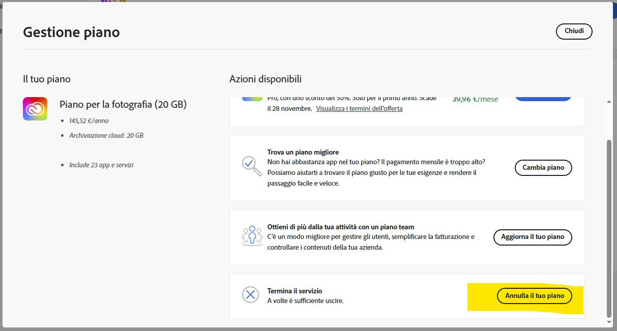 Il piano 20gb è ancora gestibile, l'ho appena rinnovato da pagamento mensile ad annuale, ma per farlo ho dovuto chiamare il commerciale Adobe perchè sul sito non si trova più niente. Io ho tenuto il 20gb solo per i crediti IA (250 vs 25). |