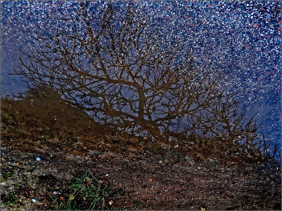 ... trattasi di uno spoglio albero di fico che si specchia in una limpida pozza d'acqua piovana e i "fiori" non sono altro che il conglomerato bituminoso multicolore del fondo stradale adibito a passeggio e pista ciclabile - la foto originale era capovolta di 180°.