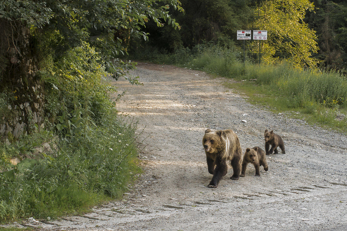 www.juzaphoto.com/galleria.php?l=it&t=2925816 poi torna indietro e va dai piccoli e per qualche minuto sta con loro. Per adesso non c'è nessun altro ed il camion è andato via. E' evidentissimo che purtroppo l'Orsa è abituata ad ottenere cibo dall'uomo. Dopo qualche minuto passano altre auto e tutti chiaramente si fermano. L'Orsa continua ad essere assolutamente tranquilla nonostante i piccoli e le auto vicine. Sono distante una decina di metri e scendo dall'auto osservando sempre il comportamento dell'Orsa. Nulla, nessuna reazione. Mi allontano dall'auto con lo sportello aperto, ma pur avvicinandomi leggermente per scattare meglio faccio sempre in modo di stare dall'altra parte dei piccoli rispetto all'Orsa per non far pensare ad un pericolo. Probabilmente e purtroppo è un'accortezza inutile, l'Orsa non fa una piega e continua tranquilla a gironzolare guardando gli altri automobilisti e me. Riesco a fare gli scatti che voglio anche perché ad un certo punto sembra quasi mettersi in posa con uno dei piccoli proprio per me.