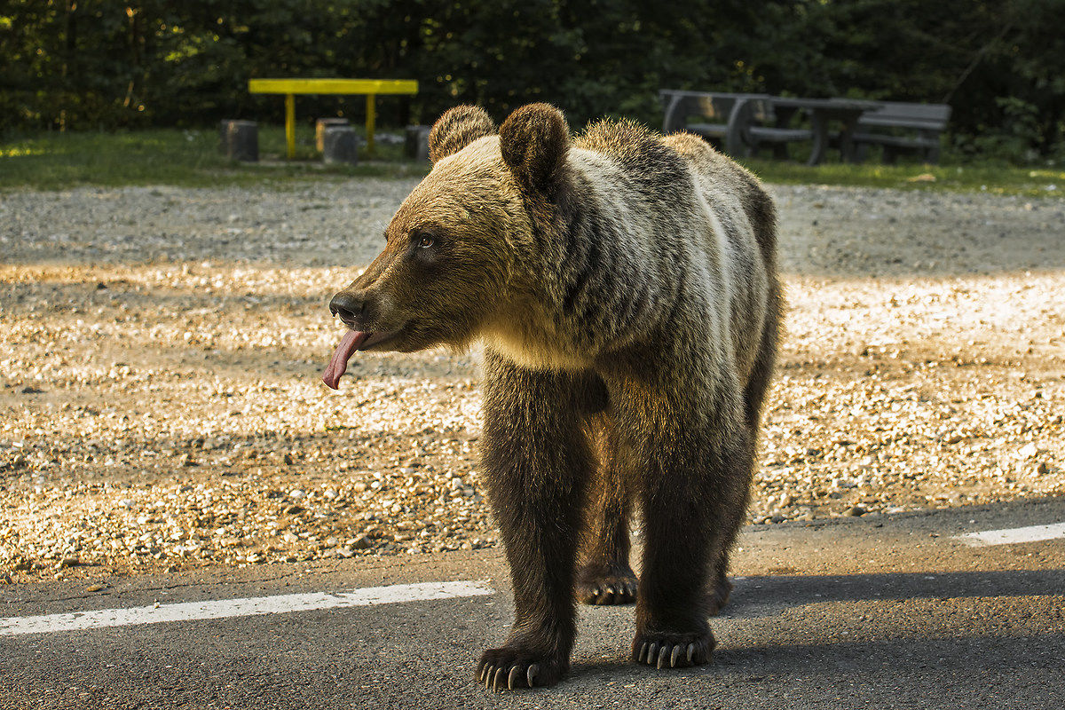 www.juzaphoto.com/galleria.php?l=it&t=2925774 Faccio una sosta, mi allontano dalla massa e pranzo. La discesa dall'altra parte che inizia con un lungo tunnel, sempre verso sud, è tutt'altra cosa. Mi considero un instancabile guidatore, ma gli 85km in discesa fino a Curtea de Arges sono infiniti. Un'unica curva in cui il volante sta dritto solo nel passaggio da una sterzata a destra ed una a sinistra, ci metto un tempo spropositato e se non stessi guidando mi si rivolterebbe lo stomaco. Strada però assolutamente spettacolare dentro un meraviglioso bosco. Mentre il busto dondola a destra e sinistra seguendo le curve, costeggiando il Lago Vidraru, l'incontro e l'episodio più importante dell'intero viaggio. Un camion che viaggia in senso opposto è fermo ad una curva davanti a me e mi costringe a fermarmi. All'inizio non capisco perché non si muove, poi li vedo. Un'orsa con due piccoli è a bordo strada.
