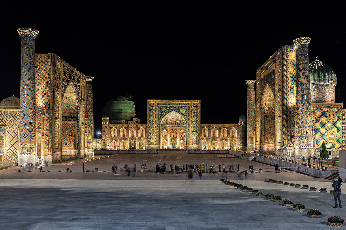 Piazza Registan con le sue 3 Madrasse, monumento di architettura medievale nel cuore della città antica di Samarcanda