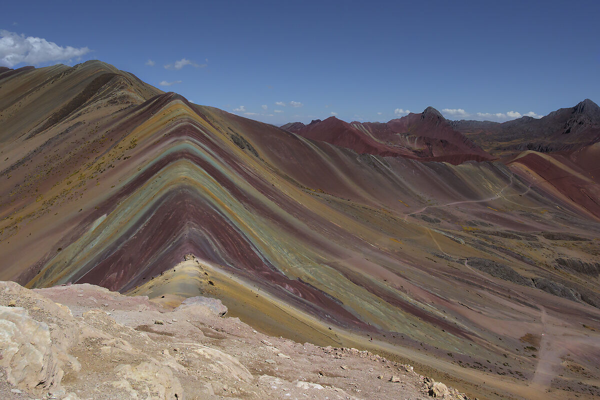 15.08.2019 Il nostro ferragosto l'abbiamo trascorso sulle Rainbow Mountain in Perù. Sicuramente la prova fisica più impegnativa e faticosa che abbiamo mai provato...arrivando dall'Amazzonia (a livello del mare) risalendo fino a quota 4600mt in auto e raggiungendo poi quota 5100mt a piedi con gli zaini in spalla...con l'aiuto dell'ossigeno. Siamo arrivati in cima che eravamo praticamente da soli...un'ottima gestione della nostra guida Angel sulla scelta giusta dell'orario sia per la luce (quella di mezzogiorno mette maggiormente in risalto i colori) che per aver evitato i numerosissimi turisti che ogni giorno affollano ormai queste montagne (è l'attrazione più richiesta in Perù dopo MachuPichu). Che dire, uno dei luoghi più belli ed emozionanti mai visti...queste montagne valgono il viaggio in Perù, un vero spettacolo!!! E' da pochi anni che sono visibili, a causa del riscaldamento globale la neve che le ricopriva si è sciolta...e sono emerse queste magnifiche rocce dai sette colori.