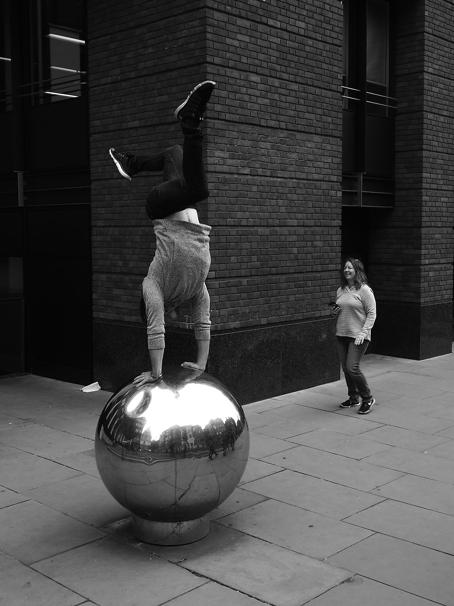 Mi piacciono due cose: la realizzazione in B/N classica, un neorealismo compositivo (dettagliate le texture muro/sassi e ottimo il chiaroscuro) in cui tutto valorizza la gestualità ovvero la ricerca di un punto, stabile sul terreno; la provocazione rispetto al tema, ovvero in tutto ciò che sfugge, nella caoticità dell'attimo c'è appunto, per contrapposizione, la ricerca di un "centro di gravità permanente". Insomma io l'ho letta così, l'unica che affronta il tema sul piano concettuale.