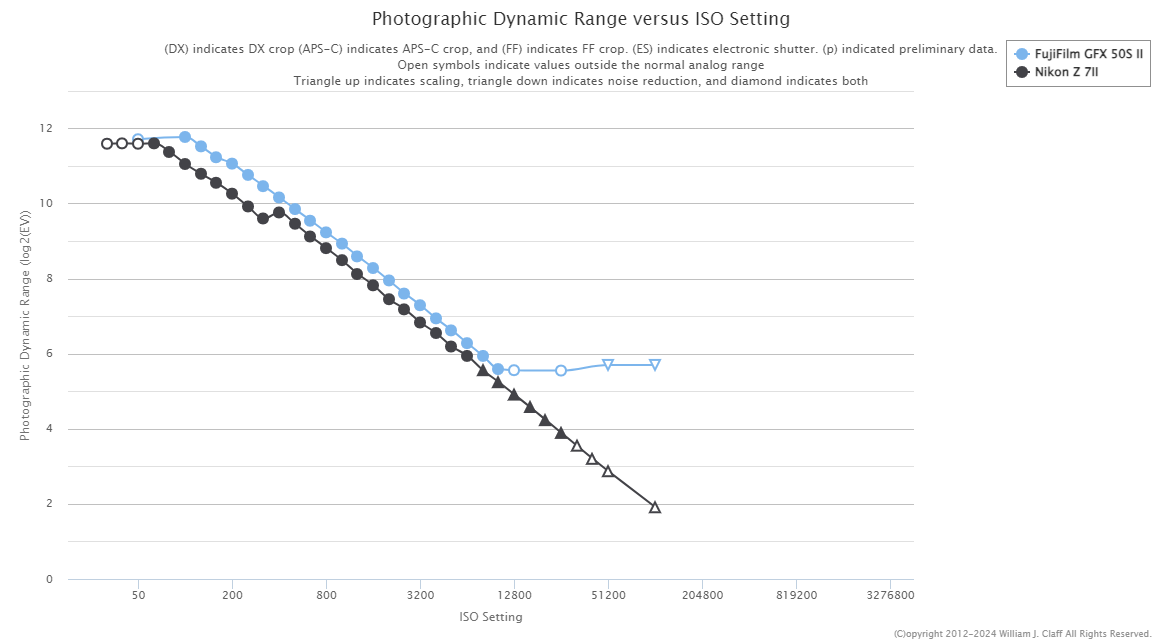"Hanno qualità di immagine da vendere," A me delle chiacchiere e delle opinioni altrui "nummene potrebbe fregà de meno", io considero solo le misure vere. La GFX 50 SII ha la QI di una 35 mm, ha solo il sensore più grande, dunque ti fornisce vantaggio qualitativo di immagine solo se tu stampi veramente molto grande, tipo l'A0, e questo è dovuto unicamente al minor Rapporto d'Ingrandimento del sensore più grande rispetto a quello più piccolo. Qui c'è un confronto della Gamma Dinamica tra quella Fujifilm e la Nikon Z7II. In uso pratico le due GD sono identiche, la differenza è solo strumentale, idem per gli altri parametri della QI, a parità di dimensione dell'immagine finita, avrai solo un po' meno rumore, sempre per il diverso RI, ma lo vedrai solo su stampe enormi. A 12800 ISO ed in bassa luce vera (e non semplicemente alzando gli ISO su soggetto illuminato bene!) la GD è un cesso per entrambe, non permette stampe nemmeno di qualità media, saranno vili per entrambe.
