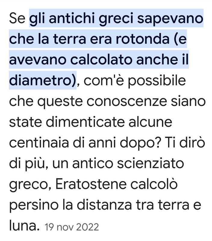 Non sono state le religioni ad azzerare il sapere ed il pensiero, le religioni c'erano già ai tempi di Eratostene. Il sapere si "perde" con la sua mancata diffusione e con il non uso dello stesso. Il fatto che la terra fosse rotonda era sconosciuto ai più, e di nessuna utilità pratica, non c'era l'interesse ad andare oltre il mondo conosciuto, che era già "troppo grande", stessa cosa per il sapere la distanza tra la Terra e la Luna, saperlo o meno, non cambiava nulla. Riguardo il "pensiero", nessuno può fermarlo, si può tentare di contenerlo di impedirne la manifestazione, ma alla fine viene fuori, sempre e comunque. Inoltre, le religioni stesse, sono sapere e pensiero, non solo dogmi, anzi spesso è proprio grazie alle religioni che il "pensiero" si afferma. Pensiamo all'idea di eguaglianza tra gli esseri umani, è venuta fuori grazie al "pensiero" cristiano. Il generalizzare non è mai buona cosa, fa buttare il bambino insieme all'acqua sporca. |
