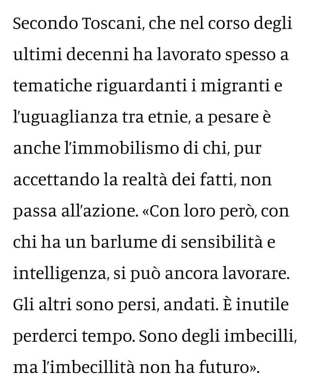 “ Toscani per quanto mi riguarda, era solo un prezzolato, un mestierante, che ha fatto soldi con le disgrazie e le morti altrui, con gli scandali, col sesso.