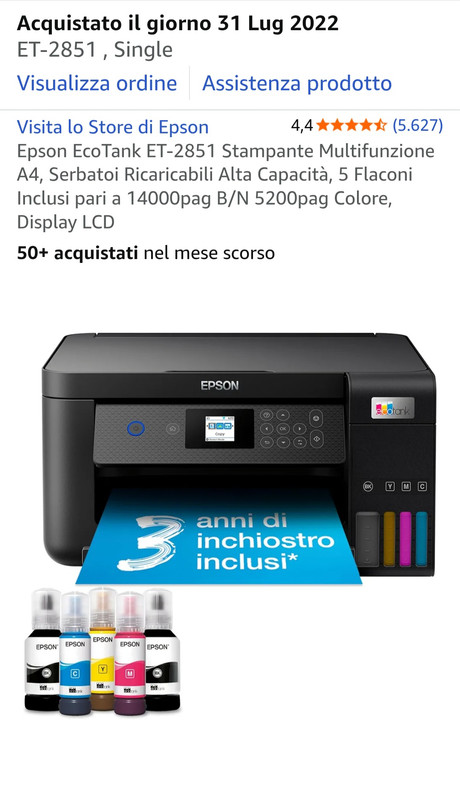 Ciao, per stampe dell'università e per le mie foto in A4 (per uso familiare), nel 2022 presi una "Epson EcoTank ET-2851 Stampante Multifunzione A4, Serbatoi Ricaricabili Alta Capacità, 5 Flaconi Inclusi pari a 14000pag B/N 5200pag Colore, Display LCD." Ho ricaricato i serbatoi dopo tre anni esatti quest'anno. Come ricariche, ho voluto provare un set di compatibili (€22 tutti e 5 i flaconi). Funzionano perfettamente come le originali, nessun errore. L'unica cosa che non mi piace e che ogni tanto, quando stampo A4 a colori, sullo sfondo si intravedono leggermente delle linee, quasi invisibili ma si vedono. Per questo motivo, quando arriverà il momento di riempire nuovamente i serbatoi (tra circa altri tre anni) prenderò le ricariche originali che mi fanno stampe A4 a colori senza questo problema, per il resto la stampante funziona benissimo senza problemi anche se non stampo per lunghi periodi. Per uso casalingo, queste stampanti, permettono un notevole risparmio sulle classiche a cartucce e, il risultato delle stampe, secondo me è migliore. Consigliate le EcoTank delle varie marche rispetto alle normali a cartucce senza dubbio. Come carta fotografica, fin'ora mi sono trovato bene con delle normali A4 economiche, 120 fogli a €22 (ripeto, solo per uso familiare, chi cerca una qualità professionale di alto livello, non è questa la scelta da fare, valuterei in questi casi, un laboratorio professionale).