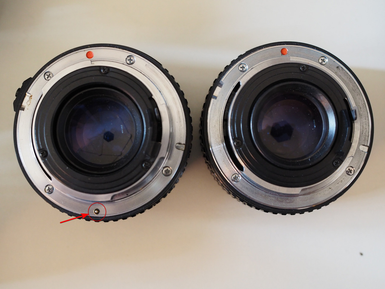 “ e ottiche di entrambi i marchi ma usandole e facendole girare non incontrai mai problemi simili „ Perchè non avevi un Rikenon P... (Quello montato di serie sulla XR-20P) Rikenon P a SX e Rikenon "liscio" a DX