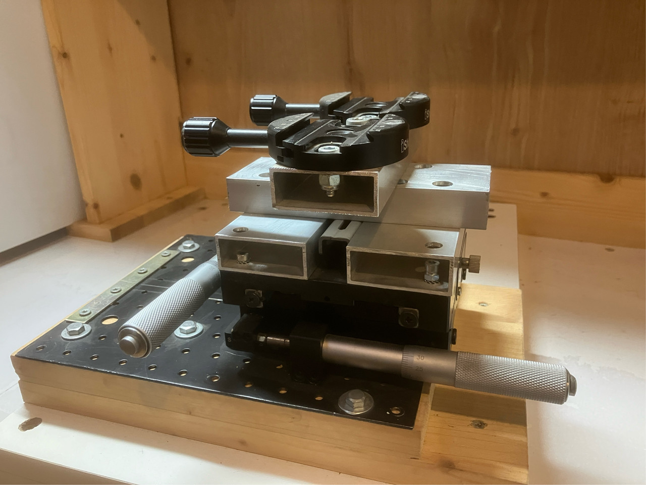 lasciando perdere la foto da telefono e il castello fatto sopra per mie esigenze questa in fatto di stabilità e precisione è ben sopra alle slitte fotografiche, pesa tre chili, ha gli scorrimenti su rulli incrociati, gioco zero/zero, pomelli x-y con divisioni centesimali e un giro completo sposta la piastra di 50 centesimi, sempre in tutte le direzioni verificato con calibro elettronico, ovviamente impensabile da mettere sul treppiede per ovvi motivi. Se ne vedono di diverse dimensioni e pesi, questa è abbastanza grande e ha la piastra da 120x120mm provvista di diversi fori già filettati M4 per montarci quello che si vuole. |