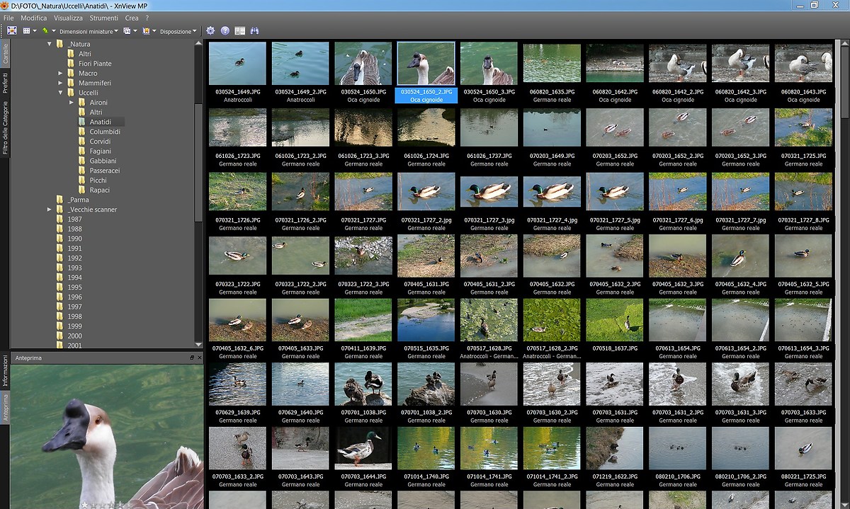 Data e ora, non impiego pochi secondi per ogni foto, ma pochi secondi per tutte; mi spiego meglio con Xnview seleziono tutte le foto (solito click sulla prima, freccia maiuscole+click sull'ultima), premo F2 e (siccome avevo già memorizzato come le voglio rinominate) premo invio, in qualche secondo mi rinomina un centinaio di foto. Io le rinomino così: 170426_2302 (per la foto scattata il 26/4/2017 alle ore 23.02) poi aggiunge un numero progressivo per le foto scattate nello stesso minuto. Per quanto riguarda il commento, stesso discorso, seleziono tutte le foto scattate a Praga, poi: ctrl+d e mi si apre un campo in cui inserire i commenti e metterò "Praga", poi volendo posso selezionare tutte le foto della cattedrale di Praga, solito ctrl+d e mi apparirà il solito campo dove cisarà già scritto "Praga" ed aggiungerò "Cattedrale" etc. E' più lungo da spiegare che da fare. Poi, quando apro il programma ho tutte le miniature con sotto il commento. |