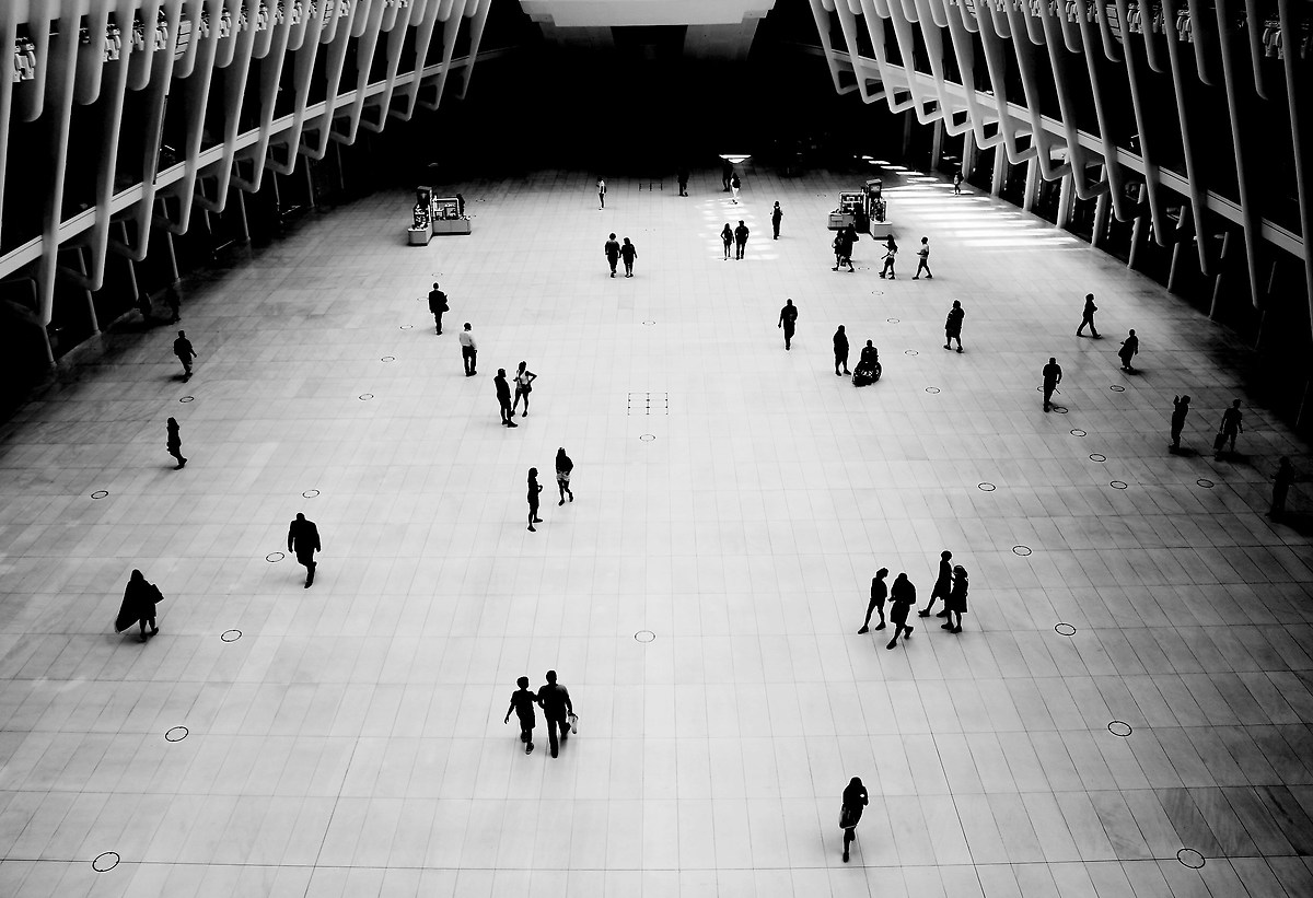 La gente passeggia, due cagnolini s'incontrano e fanno conoscenza. I padroni e i passanti guardano la scena tranne un ragazzo preso dal suo telefonino. Tutte le persone hanno la medesima distanza l'una dall'altra.