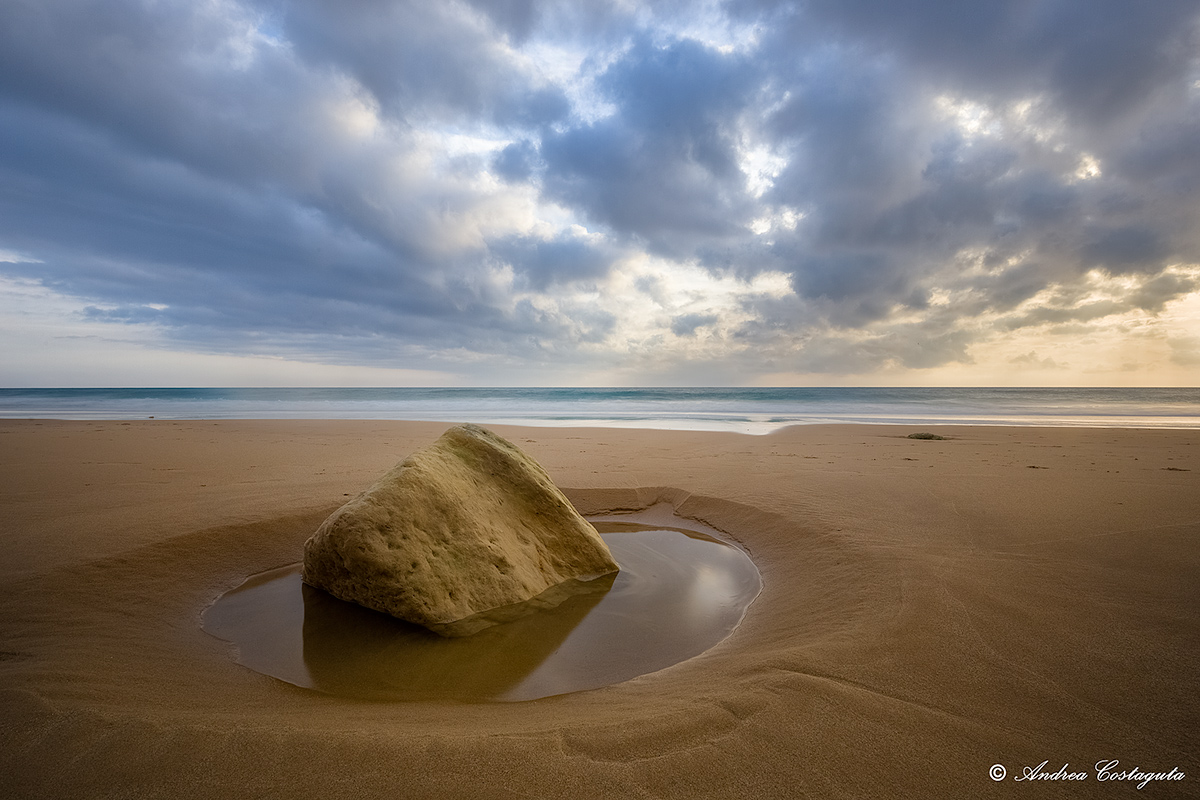 Mi ha colpito questa sabbia marrone e la singolare conformazione naturale che hai trovato; mi ricorda una sorta di meridiana! L'immagine, a mio avviso, poteva rendere ancora di più con una composizione più precisa, che includesse per intero il "cratere" nella sabbia, o l'orizzonte non perfettamente nella mezzeria, ad esempio. Inoltre, con quel cielo, una lunga esposizione avrebbe probabilmente restituito il senso del tempo che scorre, rendendo questo paesaggio ancora più "indefinito". Mi sono permesso di darti alcuni spunti perchè la ritengo una foto molto valida, Andrea, complimenti. "Un po' a piedi" di Alessandro Billiani