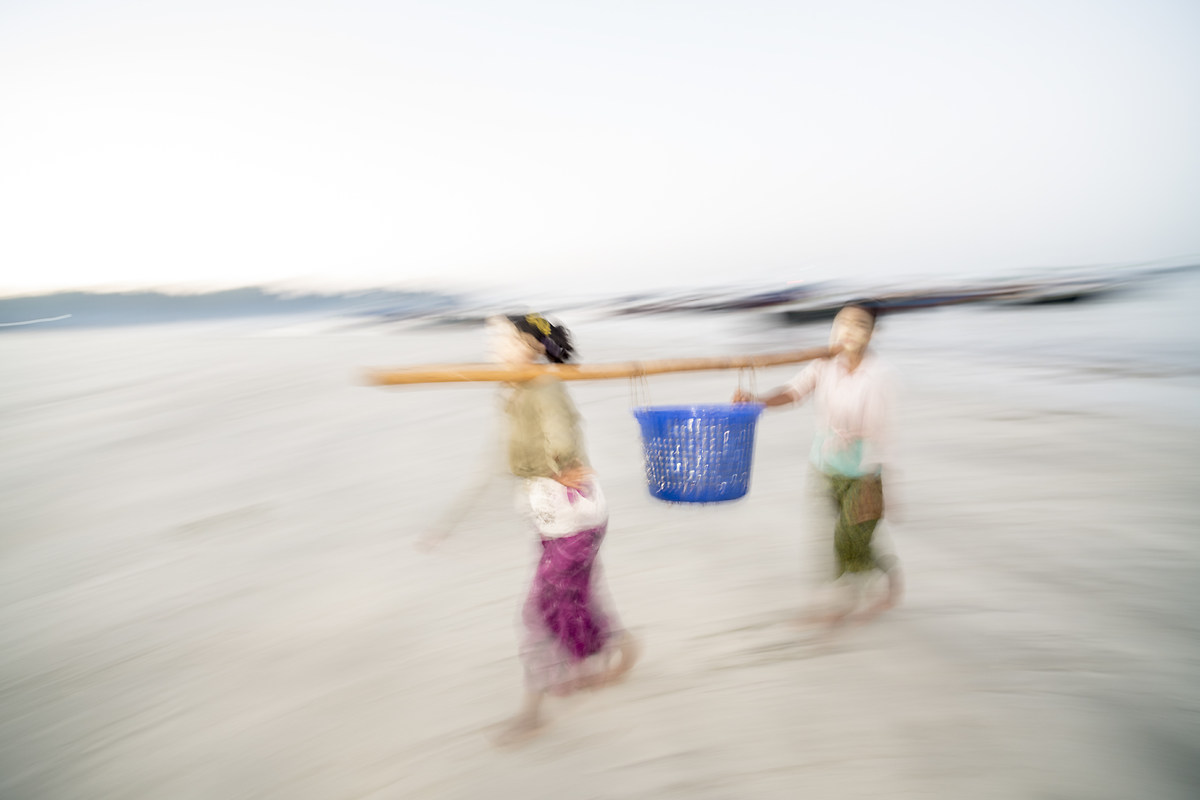 con tempi ed esposizione, mentre due donne scaricano il pesce dalle barche appena rientrate da una notte di lavoro; Myanmar.