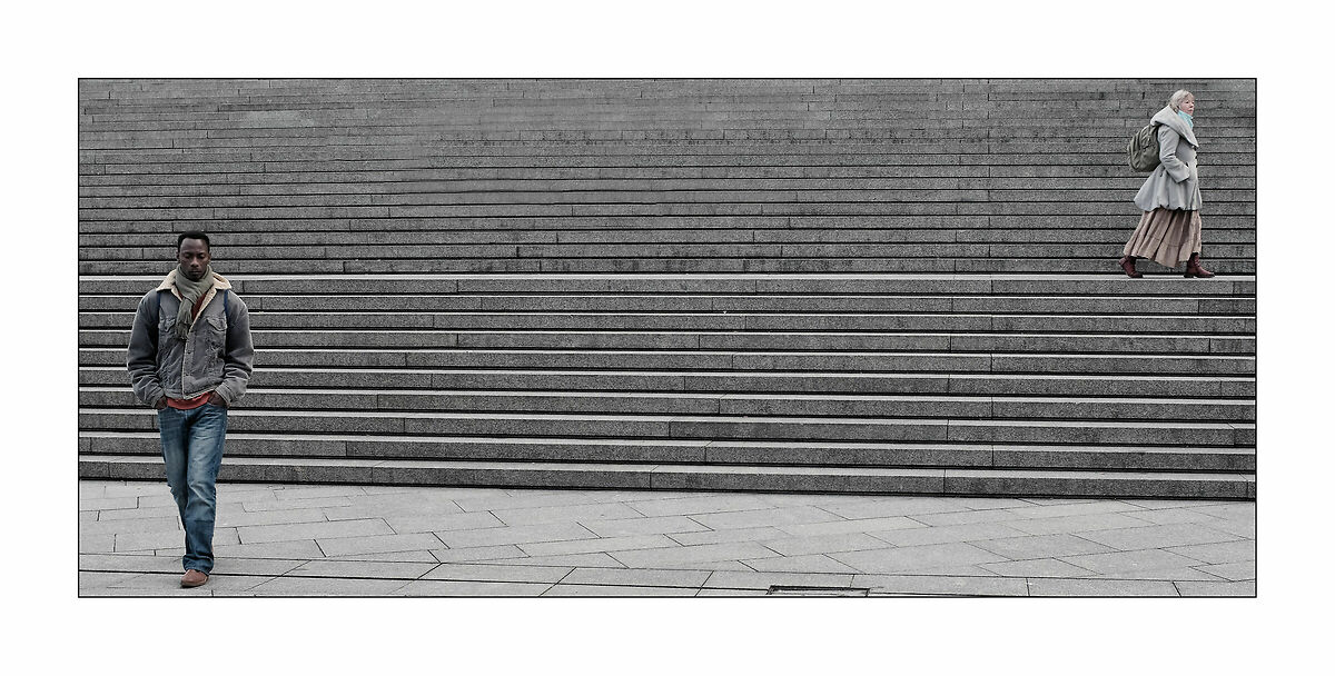 Paolo.Casciani La direzione opposta dei soggetti (uno che procede in direzione perpendicolare, e l'altro in direzione parallela alla linea delle scale), i due personaggi che tentano di uscire dalla scena e interrompono la continuità delle linee quasi orizzontali, la posizione dei personaggi che bilancia la composizione, il formato panoramico, lo sviluppo, mi hanno fatto apprezzare molto questa foto.