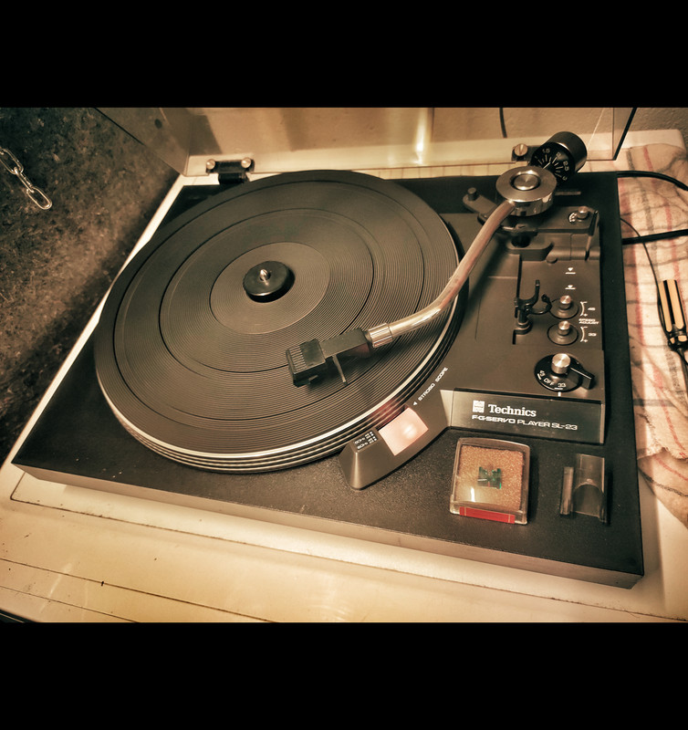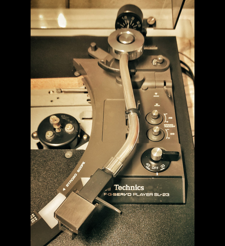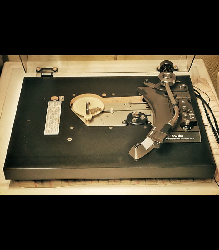 Ed ora la controparte giapponese, il Technics SL-23 (all'epoca gruppo National Panasonic). Vista generale senza il piatto monoblocco in alluminio
