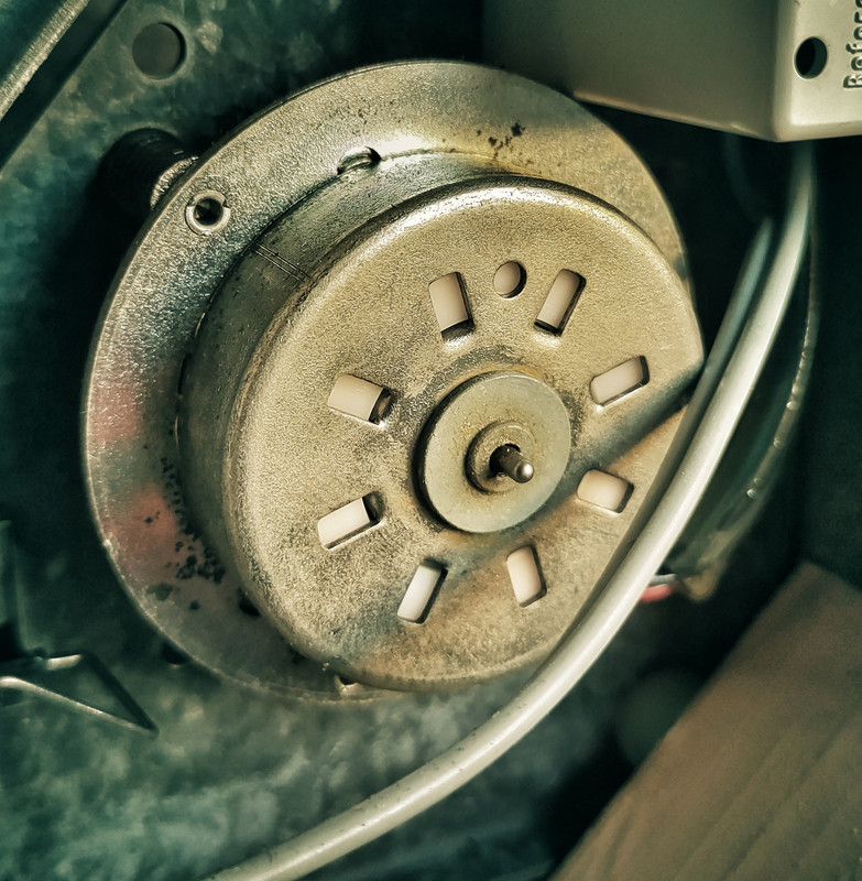 Motore sincrono in ca ancora da re-lubrificare con 2 gocce di olio per macchine da cucire, notate l'albero secchino...