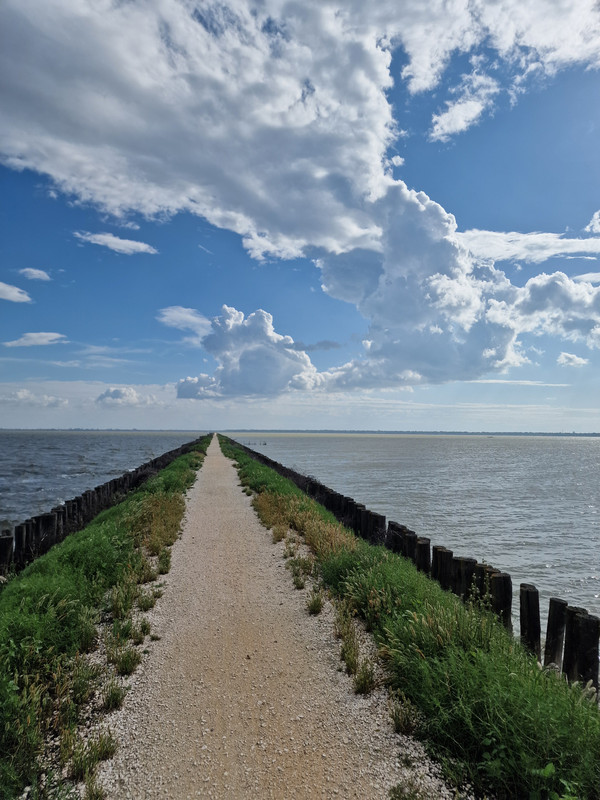 In bicicletta su un sentiero che attraversa le valli di Comacchio detto l'argine degli angeli è lungo circa 6 km in mezzo all'acqua quasi tutto rettilineo con un fortissimo vento contrario, non finiva più ho guardato più volte il GPS per vedere se il tempo stesse passando realmente. MrGreen