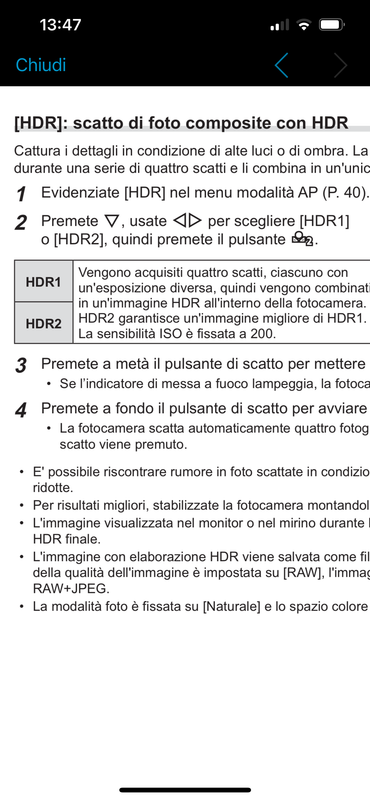 In realtà sul manuale è scritto che se selezioni la modalità HDR gli ISO sono fissati a 200, quindi è normale che Auto non vada (ma neanche gli altri valori).