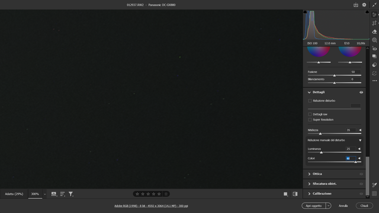 La gf10 o gx880, come volete chiamarla, usa ancora il sensore da 16mp che sotto l'aspetto hot pixel/rumore/lunghe esposizioni non è certamente il più brillante. Le cose sono migliorate con l'introduzione nelle 4/3 di panasonic del sensore da 20mp che fa decisamente meglio. Quelli in foto sono chiaramente hot pixel da lunga esposizione, per esperienza personale con quel sensore, dico che non sono nemmeno molti...ovviamente più diventa lunga l'esposizione più ne compaiono...io l'ho sempre associato ad un problema di elettronica più che di sensore. La soluzione è attivare la riduzione del rumore sulle lunghe esposizioni, che in quelle fotocamere panasonic fa in automatico un dark frame che toglie gli hot pixel già sul raw. Quando viene attivata la funzione, in abbinamento ad un'esposizione che supera il secondo (almeno mi sembra di ricordare questo tempo di scatto) scatta prima la foto, si sente chiaramente l'otturatore in funzione, poi tiene impegnata la fotocamere per un tempo altrettanto lungo con l'otturatore chiuso. Alla fine si sente la riapertura dell'otturatore. Quindi per una foto di 15 secondi, la fotocamera scatta per un tempo totale di 30.