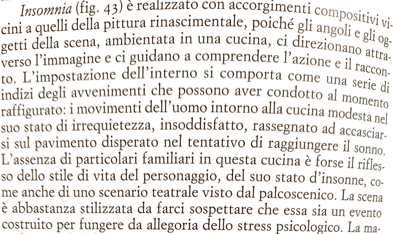 La narrazione cui fa riferimento Jeff Wall penso vada intesa come sinonimo di reportage, in quel senso la sua fotografia ne è ben lontano. Ma indubbiamente le sue fotografie sono delle storie, delle storie aperte. Per quanto riguarda Insomnia, se separiamo il particolare dellla testa dell'individuo sotto il tavolo abbiamo un Caravaggio bell'e buono |