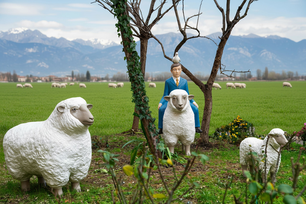 “ La lettura è semplice, nello stile di Nando Crippa l'autore dell'installazione: l'uomo ha in testa un'idea "la Pace" rappresentata dalla colomba. „ e fin qui ci siamo “ Purtroppo dispone solo di mezzi limitati (una pecora) per raggiungerla... „ ecco qui divergo, la pecora ha una simbologia chiara e quasi universale, certo non rappresenta una limitazione dei mezzi, ma un atteggiamento remissivo, di omologazione rappresentato dal gregge |