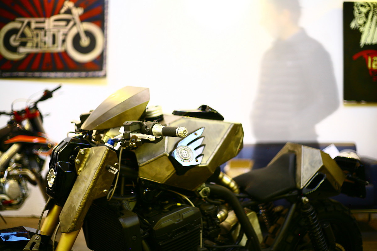 Metti la moto sulla porta dell'officina in modo che venga illuminata dalla luce naturale. Dietro il soggetto lascia un po' di spazio vuoto. Spegni le luci all'interno dell'officina. Fotografa dall'esterno verso l'interno.