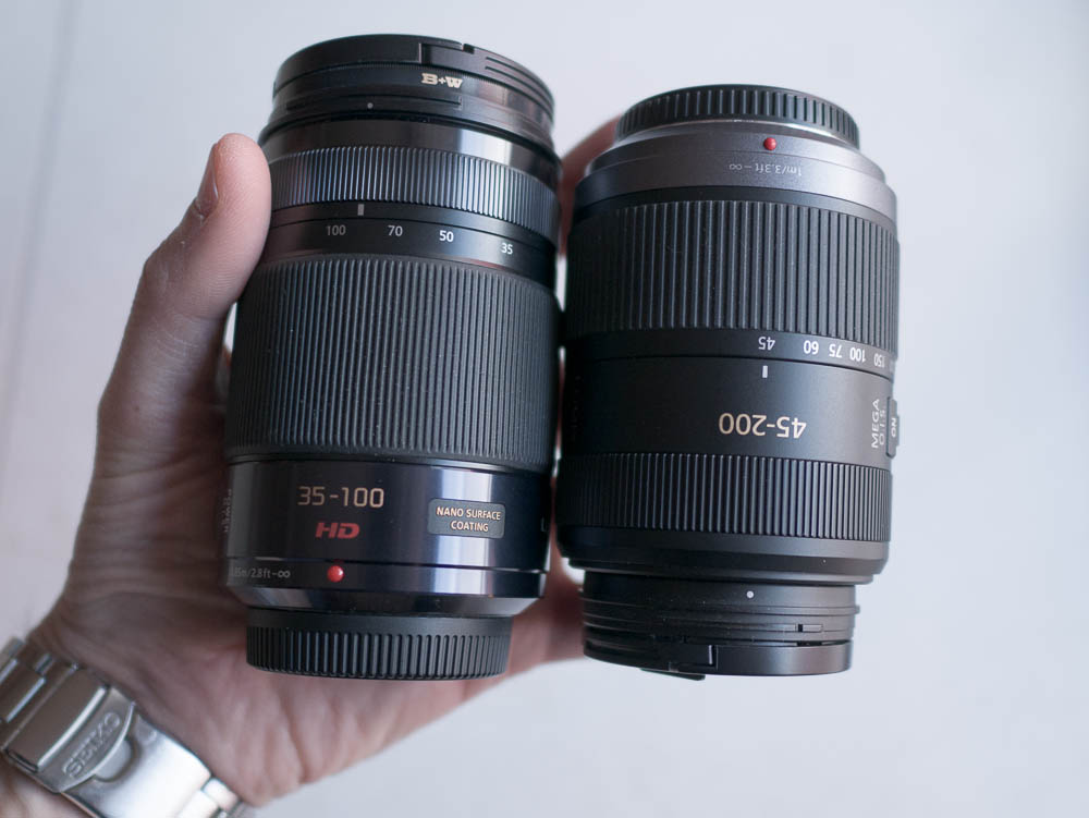 L'unica strada per ridurre drasticamente i pesi è il m4/3. Io ti posto l'immagine di uno zoom f2.8 35-100 (l'equivalente di un 70-200 sul 24X36), a fianco un 45-200 (l'equivalente di un 90-400 sul 24X36), altro che fissi senza AF!