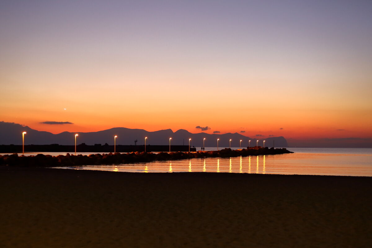 Nella luce del crepuscolo i lampioni del molo si specchiano sul mare. In lontananza un aereo si avvicina per l'atterraggio a Punta Raisi.