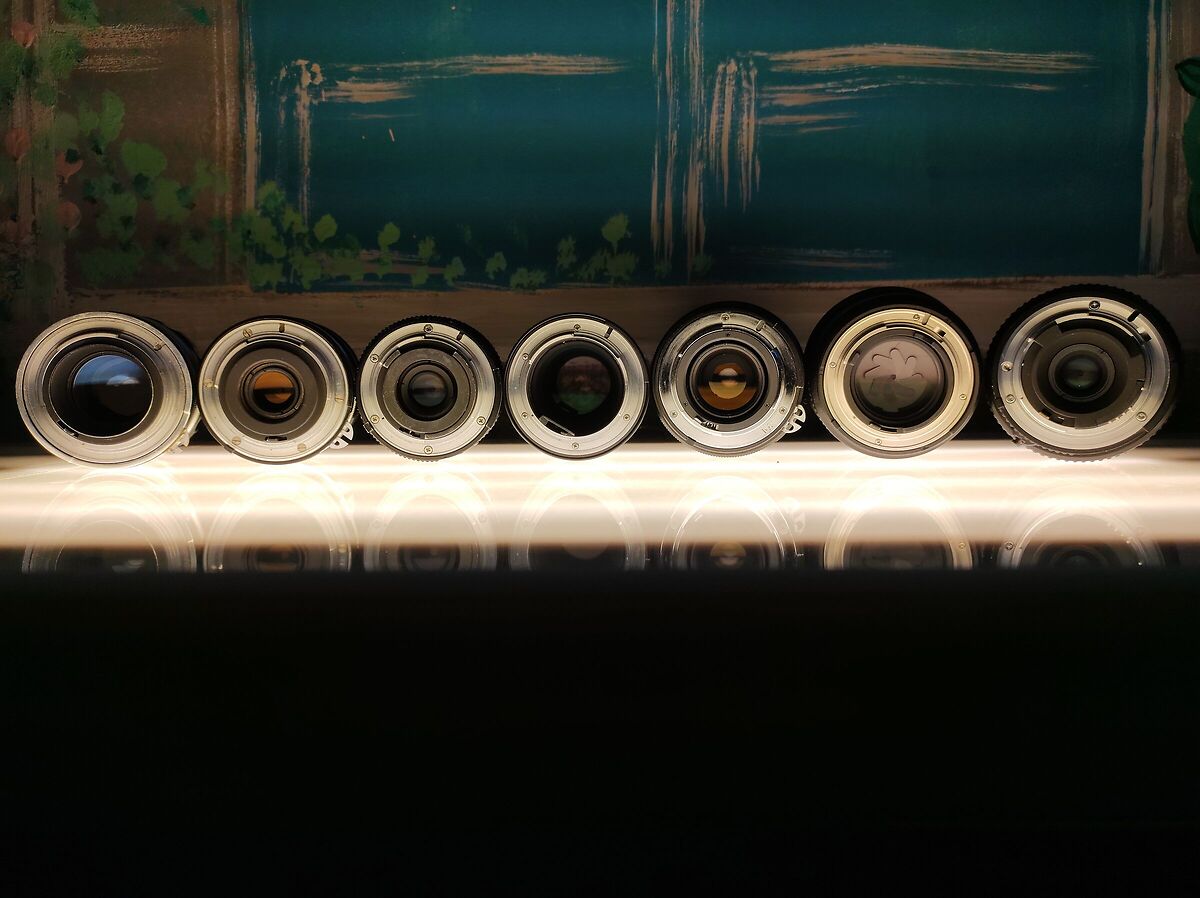 DESCRIZIONE Ecco una parata di obiettivi Nikkor visti dove da non batte il sole ... Da sx a dx Nippon Kogaku 135-Q f 3,5 del 1963: antichissima ( il sistema F e' del 1959! ) niente viti, ottone nichelato. Nippon Kogaku 43-86 prima versione 1973, ci sono le viti ma con testa a taglio, ottone nichelato. Nikkor 43-86 f 3,5 terza serie 1980, viti con testa a croce, ottone nichelato Nikkor TC-300 1978, viti piccole con testa a croce, il materiale NON e' piu' ottone nichelato, forse alluminio o acciaio Tokina 70-210 f 3,5 circa 1980, solo 3 viti, alluminio o acciaio. SAMYANG 85 f 1,4 2009, 4 viti a croce, nicchia AI-S, alluminio o acciaio. Nikkor af 35-70 f 3,3 - 4,5 1989, 3 viti, nicchia ai-s, presa di forza per l'autofocus, alluminio o acciaio. Notate l'evoluzione della fattura, e generalmente parlando: 1) no viti -> piu' antico viti a taglio -> antico viti a croce -> meno antico 2) Ottone nichelato -> antico Altro materiale -> moderno E' materiale che scotta, mai visto prima !!!! In galleria e' a 64 mpx, per ingrandire a piacere. Foto da cell a risoluzione nativa. |