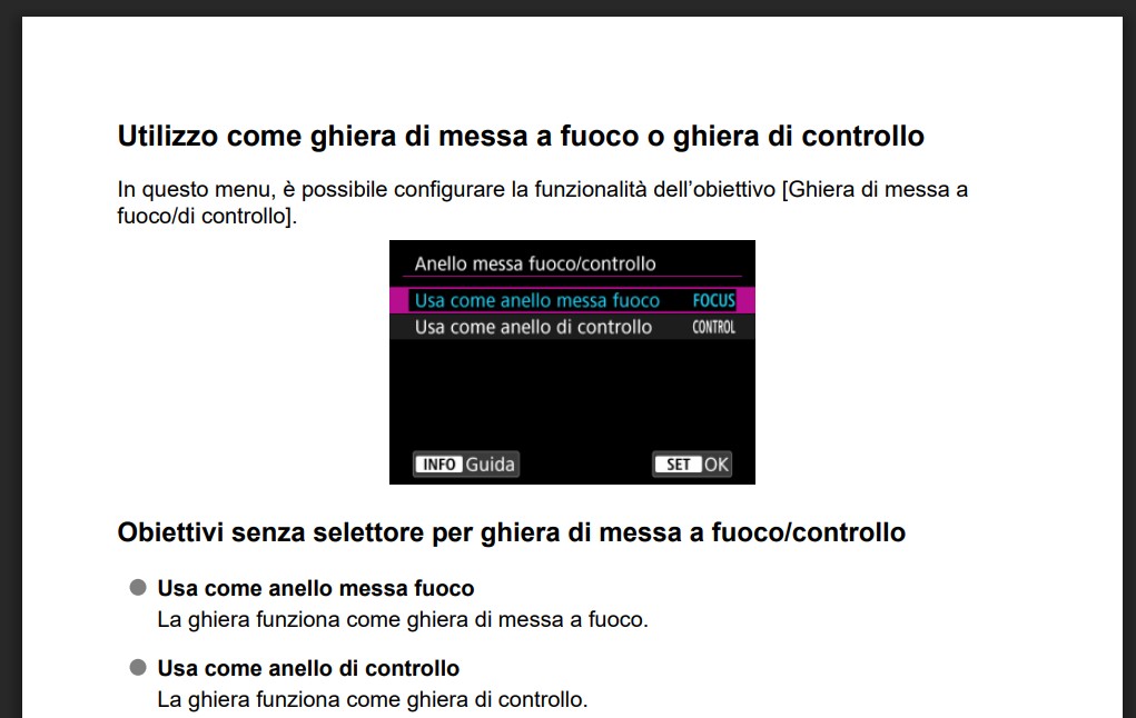 “ “ Hai attivato l'opzione nei menù della macchina per usare la ghiera come controllo invece che focus? „ Direi di si, nel menù arancione, in personalizza ghiere, a quella dell'anello di controllo ho impostato Iso „ Sulle lenti RF che non hanno lo switch fisico per decidere quale delle due funzionalità usare, bisogna attivare l'opzione specifica in camera.