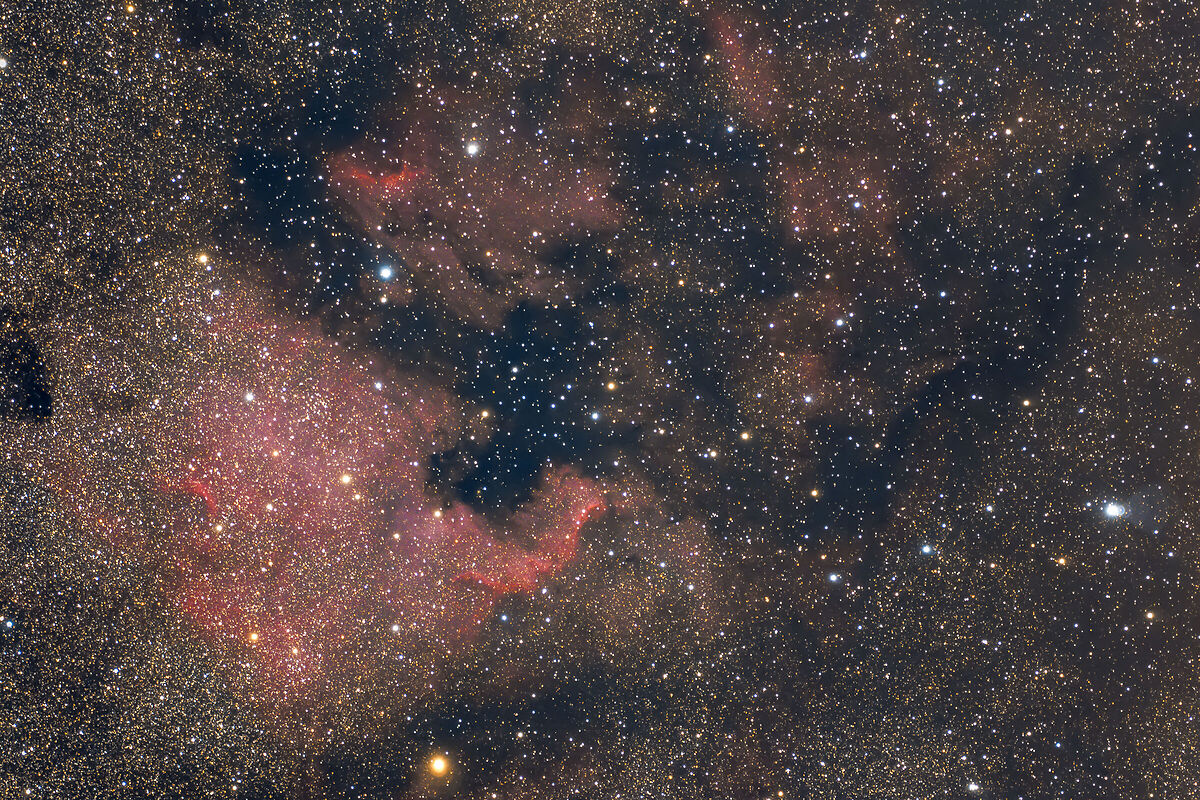 “ Rispetto a tantissime altre foto scattate anche con attrezzature non molto diversa dalla mia (posto un esempio: www.juzaphoto.com/galleria.php?l=it&t=3271014), c'è una pulizia del cielo decisamente maggiore (tradotto, con poche stelle, solo le principali visibili). „ La foto che hai postato come esempio è una ripresa in banda stretta, nello specifico con un filtro che lascia passare solo l'emissione dell'idrogeno e dell'ossigeno Questo porta ad avere un minor numero di stelle e quelle presenti sono solitamente di dimensioni più piccole, quindi un miglior contrasto e visibilità della nebulusità Il problema è che così facendo perdi i colori delle stelle! Ritornando al tuo caso specifico è assolutamente normale ottenere tutte quelle stelle visto che l'area da te ripresa si trova proprio sulla via Lattea Nelle riprese RGB come la tua se si vuole evidenziare maggiormente le nebulosità si riducono le stesse con tool appositi, io utilizzo uno script per PixInsight, non saprei consigliarti altri metodi P.S. Comunque il risultato è decisamente buono, perfettamente in linea con quanto puoi ottenere con una normale camera a colori |