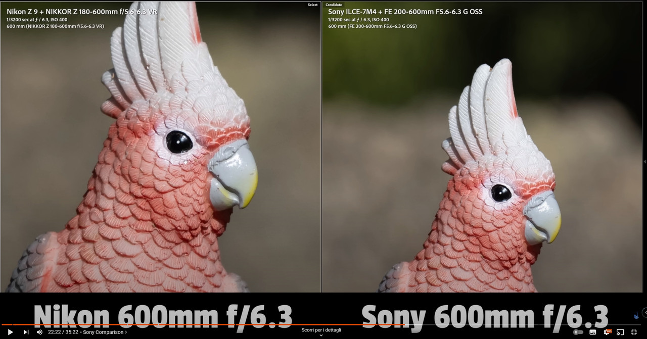 AntoP21 “ Un altro fattore che si fa notare nel video però, è al minuto 22:18, in cui si vede molto chiaramente la differenza di nitidezza tra gli obiettivi confrontati, a favore di 200-600 e 100-500. Differenza non trascurabile aggiungerei, poi confermata anche dai moltiplicatori. „ Differenza che nemmeno sussiste, ma che è palesemente creata dall'autore del video, visto il confronto ridicolo che fa. Lore-71 lo ha spiegato: come fai a confrontare quelle due immagini a 600mm (Nikon vs Sony) se in quella del Sony il soggetto ha dimensioni pressoché dimezzate rispetto a quelle del Nikon? E comunque, anche così, a me sembra avanti il Nikon. P.S. la Z8 NON è l'ammiraglia Nikon. So che fa comodo definirla tale quando schiaccia la concorrenza, ma sulla carta non lo è. È semplicemente migliore rispetto ai prodotti di pari prezzo degli altri brand |