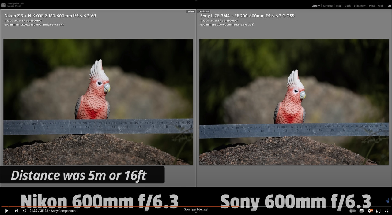 “ Un altro fattore che si fa notare nel video però, è al minuto 22:18, in cui si vede molto chiaramente la differenza di nitidezza tra gli obiettivi confrontati, a favore di 200-600 e 100-500. Differenza non trascurabile aggiungerei, poi confermata anche dai moltiplicatori. „ AntoP21, dove la vedi questa grande differenza al minuto 22:18? quello che vedo io da quanto postato nel video (sempre che le riprese siano state eseguite dal medesimo punto) è che a 5 metri e a 600 mm il Sony sembra avere un angolo di campo maggiore rispetto al Nikon in quanto il Sony inquadra una porzione orizzontale di 40,5 cm mentre il Nikon 37 cm.