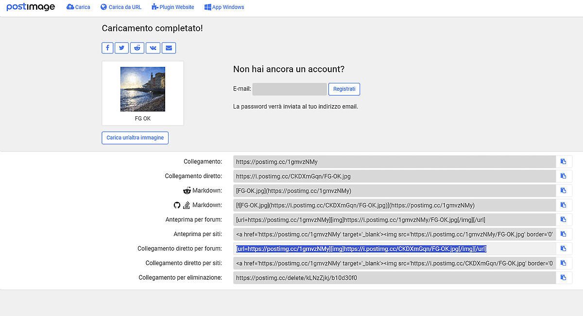 Effettuato il collegamento con PostImage, selezionare il riquadro che permette la selezione dell'immagine