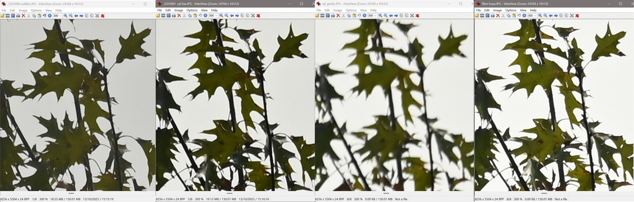 Per me è inutile giocare sui termini 'rovina o migliora' perchè il filtro fa entrambe le cose in molti casi migliora come può essere l'impiego di un CPL o di un KR1.5 ai tempi delle diapositive (del quale non potevo fare senza per evitare toni eccessivamente blu quando usavo l'Ektachrome) In alcuni casi poggiora come il caso -disperato- che allego qui sotto e poi... peggiora sempre, nel senso che avendo un vetro ulteriore davanti alla lente si ha uno scadimento (teorico) dell'immagine, ma... questo scadimento è percepibile solo a livello strumentale, perciò... Vediamo un esempio: quelli qui sotto sono dei prinscreen di ingrandimenti al 300% di dettagli tratti da immagini da 45 mpixel. - senza filtro - con il cpl b+w - con il cpl giotto - con filtro hoya