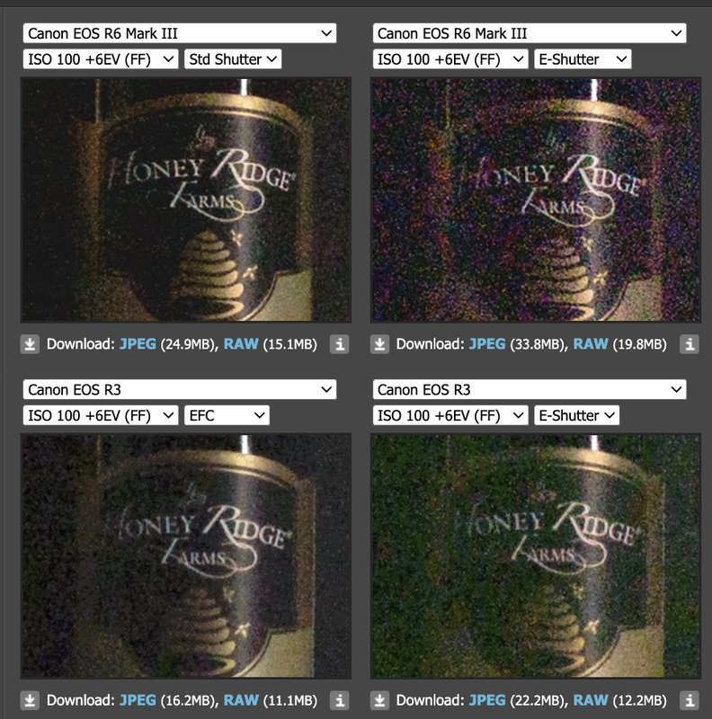 Vi posto il comparometro con l'iso invariance, dove abbiamo uno scatto di R6III e R3 a 100 iso tirato di 6 stop. Sia con scatto meccanico che elettronico. Precisiamo che è una situazione limite e che uno scatto sbagliato di 6 stop è da cestinare. Ma è indicativo di come si comporta il sensore. Grossomodo quelle differenze anche se magari minori le ritroviamo anche con recuperi minori. Si evince come la QI della R6MKIII sia superiore a quella della R3. E si evince come le possibilità di recupero delle ombre su queste due Canon siano ben peggiori quando si usa lo scatto elettronico.