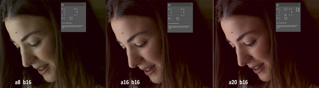 Ma la cosa un po' più interessante da approfondire è il rapporto fra a e b. OK: b>a, ma di quanto? Non mi pare ci sia una regola fissa... dipende dall'illuminazione, moltissimo dal tipo di incarnato e naturalmente dal risultato che vogliamo ottenere. Ho fatto diverse prove con RAW scaricati in rete e in generale mi pare provvisoriamente di aver capito (non è una legge assoluta) che il rapporto può stare fra circa 3:4 (come nell'esempio) a 1:1 (a=b). In un'illuminazione "naturale" comunque b>10. Questo naturalmente non in caso di un'illuminazione assolutamente strampalata (palco concerti, subacquea, ...) dove comunque le indicazioni generali valgono come tendenza se si vuole recuperare qualche "caso disperato". Variando il rapporto fra a e b, quando a è molto inferiore a b, l'incarnato prende un tono sul giallo (esagerando, sul verde) quando a si avvicina a b o lo supera il tono diventa sul rosa. E mi vengono in mente le infinite discussioni su "L'incarnato del sensore di C è migliore di quello di S! Non è vero! Quello di N è ancora meglio!". Tanto per dire su cosa si versano fiumi di inchiostro sui forum e su come si potrebbe arrivare facilmente al risultato che ci piace solo variando il rapporto a,b...