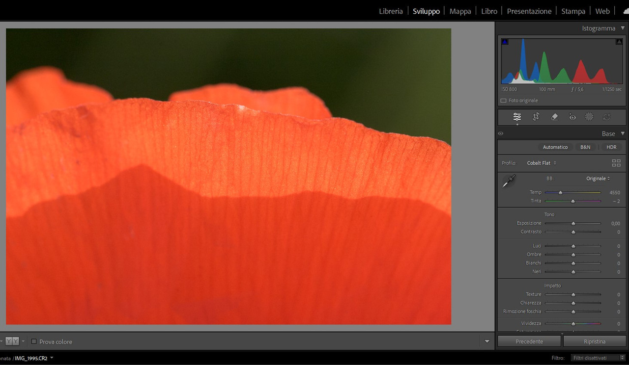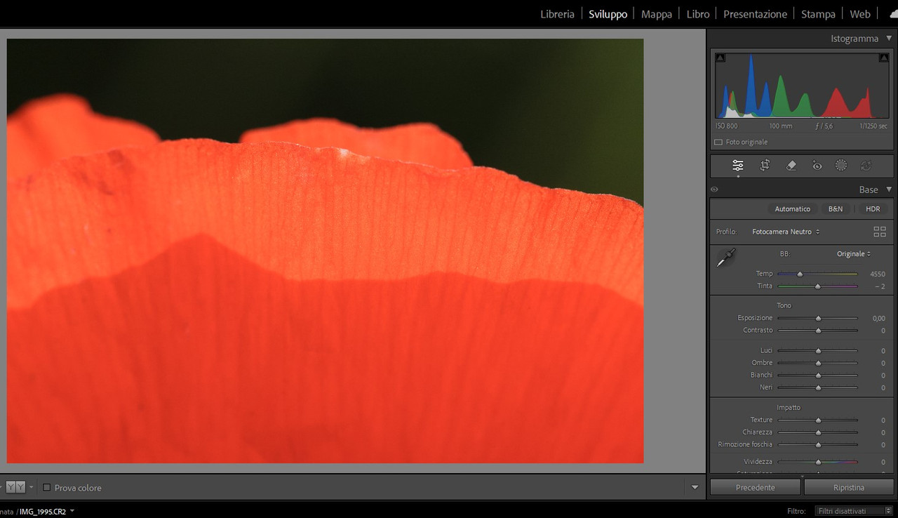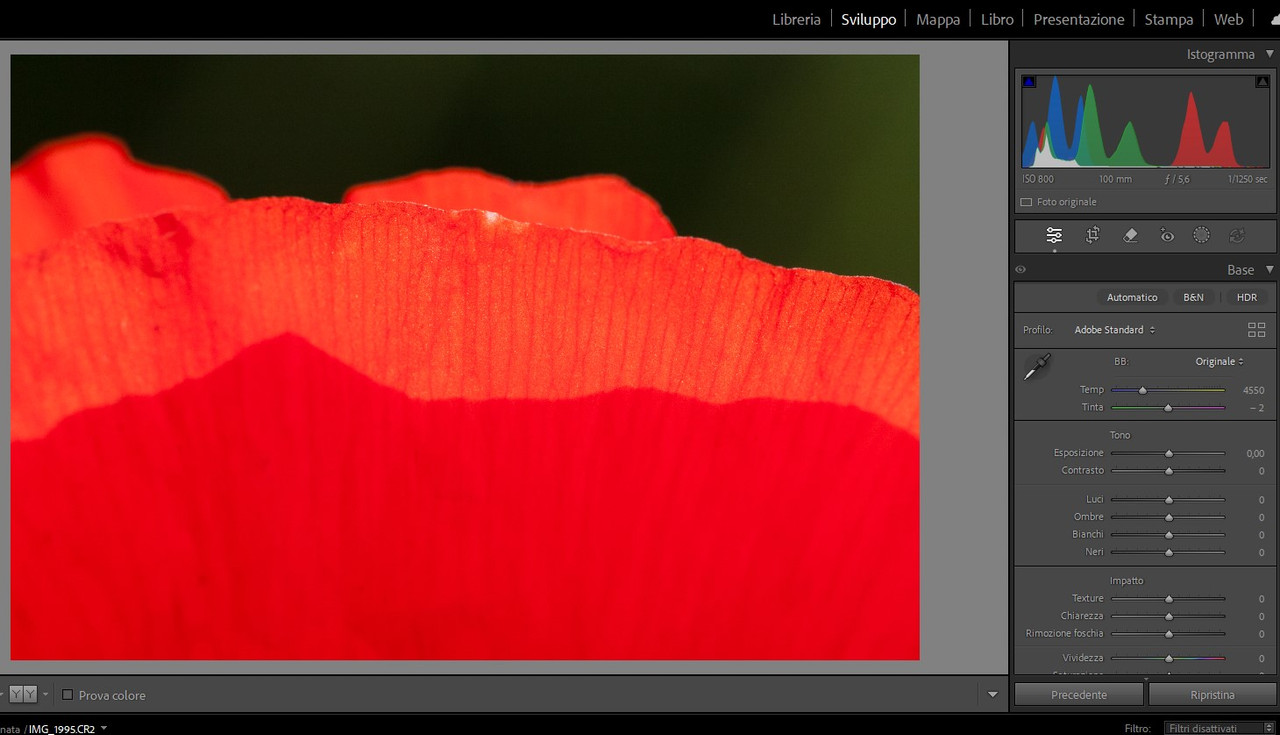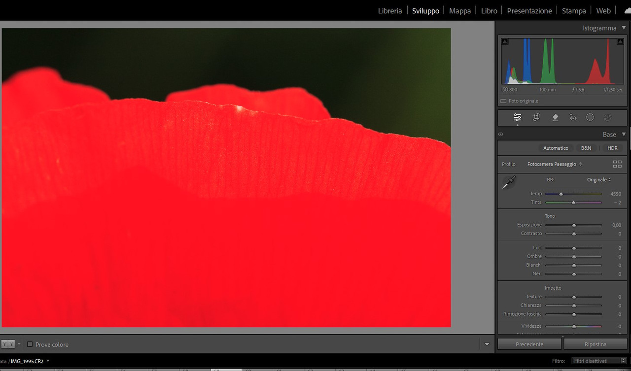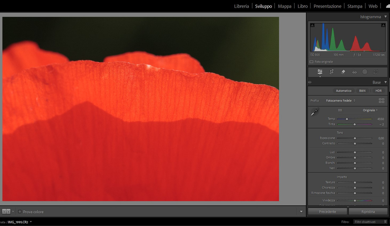 “ comunque... che il rosso saturi prima degli altri colori è storia vecchia e risaputa... Bob Atkins, diversi anni fa... „ Ho letto l'articolo che citi, Lorenzo, e forse oggi è un po’ datato… Va premesso che se un canale è davvero clippato, si può fare veramente poco… Però la valutazione non si fa guardando l'istogramma sulla fotocamera (che legge il jpg immerso nel raw), andrebbe invece fatta sul raw con un software specifico tipo Raw Digger. Se non ci sono canali sovraesposti, con i convertitori che abbiamo oggi recuperare saturazione e luminosità di un colore è una cosa abbastanza semplice, senza disturbare Photoshop. |