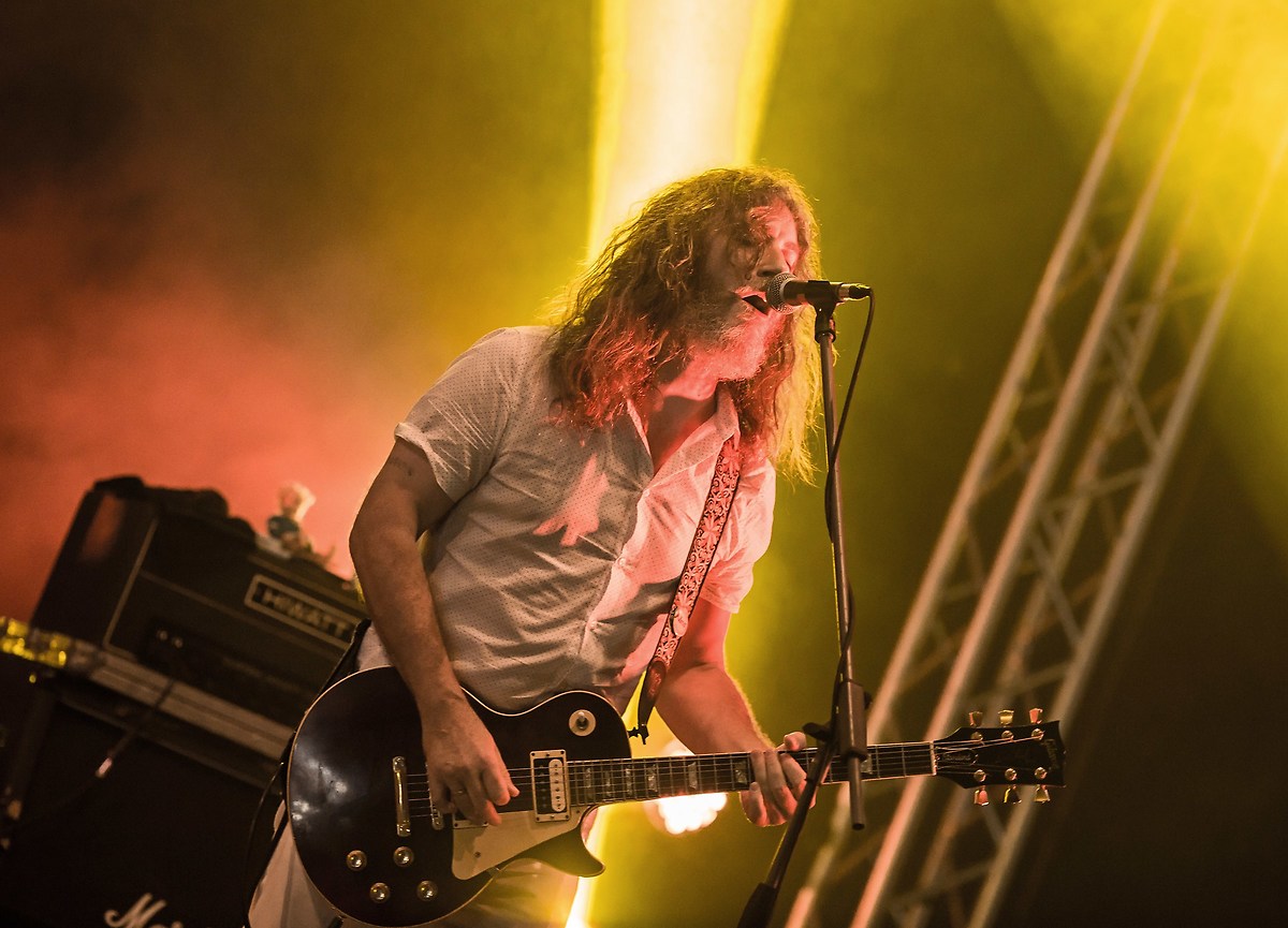 Luce gialla dietro il chitarrista e dal basso luce rossa rosa...