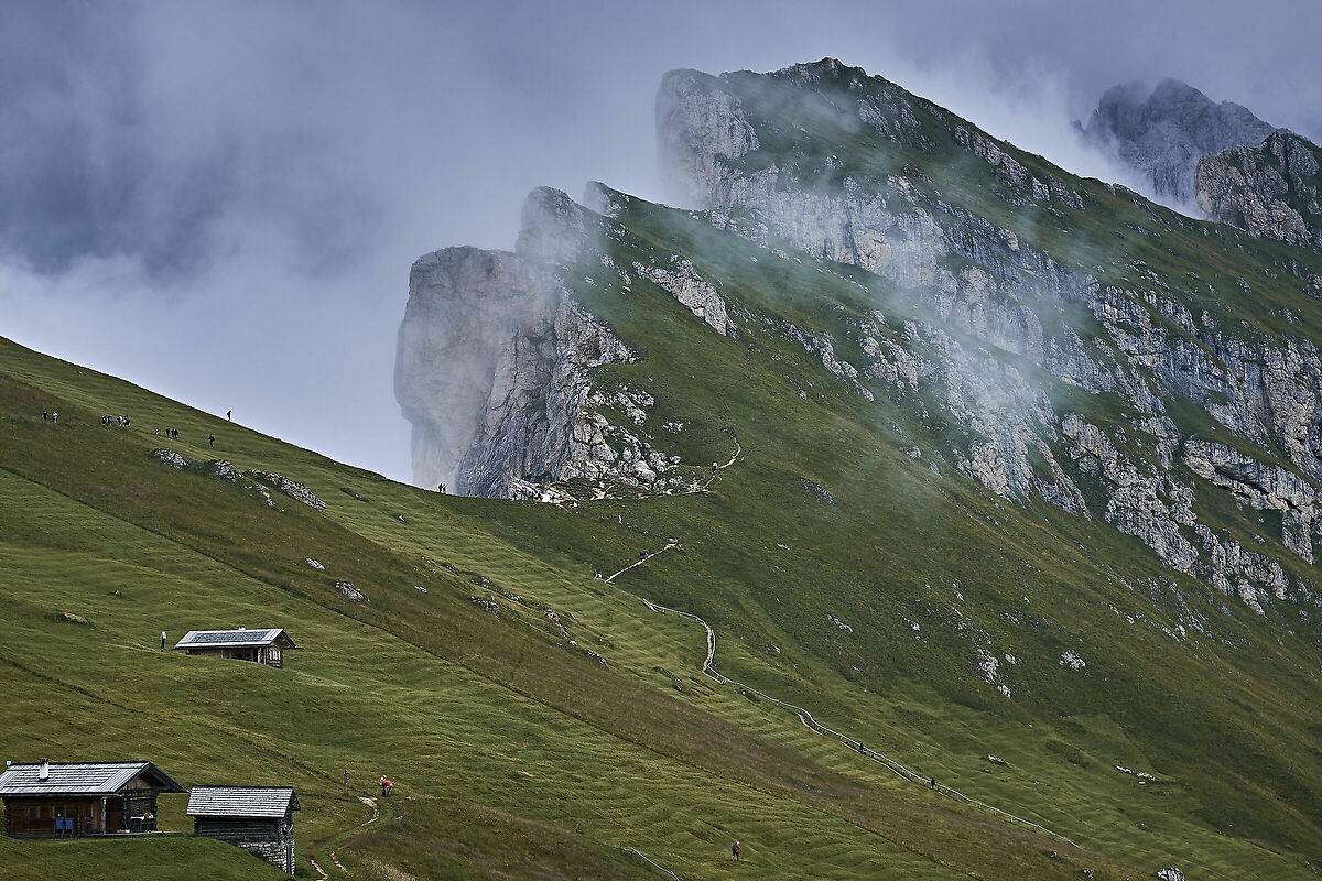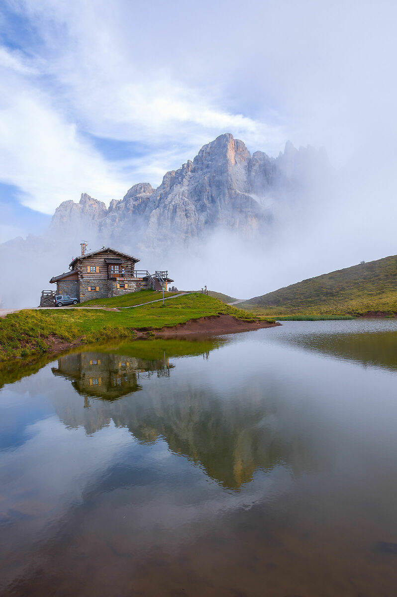 Commento: Laghetto e baita nei pressi del Passo Rolle con sullo sfondo una vetta delle Pale di San Martino (Dolomiti)
