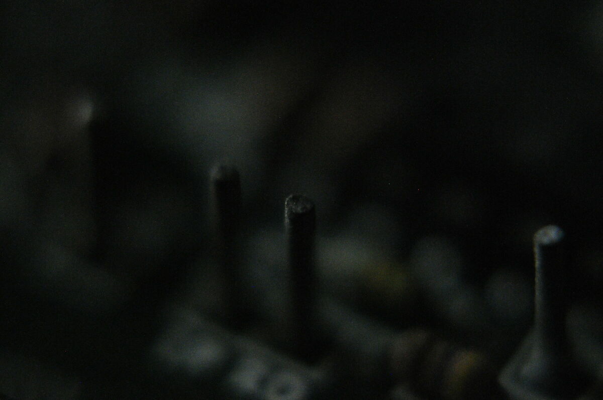 Le ciminiere sono dei test point sull'elettronica superiore di un vecchio floppy disk Teac da 5,25"/360K, i cumuli di Coke una fila di resistenze molto sfuocate, la turbina i prigionieri dei cilindri di guida per il gruppo testine del floppy. Fuoco manuale, compensazione da -2 a -3, Jpg dalla scheda cf e profilo vivid default, pp in camera.