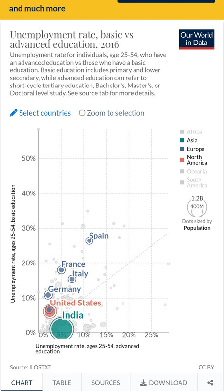 Ragazzi, i dati non lasciano scampo. Il grafico sotto confronta il tasso di disoccupazione tra chi ha una istruzione di alto livello (superiori, università e oltre) VS chi ha una istruzione di base (scuola dell'obbligo) Come potete vedere, nelle economie più avanzata il livello di istruzione paga (e ci mancherebbe), perché i disoccupati sono meno tra i più istruiti rispetto a chi ha una istruzione di base (i punti stanno al di sopra della diagonale tratteggiata, che indica la parità). Questo grafico dovrebbero mostrarlo nelle scuole! Al contrario, nelle economie più arretrate la situazione è diversa. Quindi, adesso come nel futuro, un sistema di istruzione efficace sarà decisivo per il futuro delle persone. Da notare come l'Italia performi peggio di Germania e stati uniti. "Ah ma le piccole imprese sono il nostro petrolio mentre le grandi multinazionali sono il demonio evasore". Ho finito vostro onore.