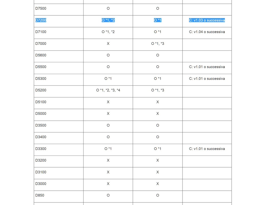 “ Per le ottiche, questo 70-300 AF-P sarebbe il modello per le FF? Che quindi ci guadagnerei in lunghezza poi? „ Si perché, su DX, detta un po' così, sarebbe come usare un 105-450mm. Ma io ne faccio una questione di qualità, oltre che di opportunismo. Se in futuro, l'ho scritto prima, deciderai, un giorno, di passare a FF, essendo compatibile, non avrai bisogno di disfartene. Cosa che non potrai fare con la versione DX, anch'esso fuori produzione. Relativamente alla compatibilità citata da Lorenzo1910, qui sotto c'è una tabella relativa alla compatibilità con un gruppo di reflex