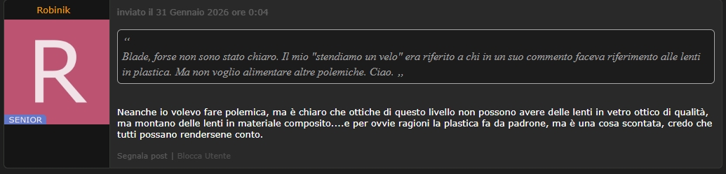 “ Blade, io ti capisco....mi rendo conto che molto probabilmente, essendo tu di indole aggressiva hai bisogno di sfogarti con qualcuno, e per questo quindi, accetto anche il fatto che tu abbia deciso di rompere i maroni proprio a me, e me ne faccio una ragione. Però quelle che tu chiami congetture sono deduzioni logiche, il vetro ottico di qualità costa, e pesa! Non si può pretendere che una lente di questa categoria sia costruita con vetro ottico, ma la cosa più logica è che siano state usate lenti in resina, che oltretutto è un tipo di costruzione molto diffusa, non solo per produrre lenti a basso costo, oramai si usa anche nella costruzione di lenti di alto livello, sempre per contenere pesi e costi. „ Guarda che io non ce l'ho con te in specifico. A me da fastidio chi giudica male il prossimo, e tu lo fai in continuazione, compreso questo post. Poi se leggo imprecisioni, per non dire sciocchezze, lo faccio notare. Ti senti preso di mira, (peraltro ti sei autoreferenziato quel mio post, ma non era rivolto a te nello specifico) perchè non scrivi una affermazione corretta che sia una. Il giorno in cui scriverai qualcosa di sensato non avrò problemi ad ammetterlo. Ad esempio, l'equazione tanto peso = tanta qualità = tanto costo non ha alcun valore, è una valutazione superficiale. Esiste il progresso tecnologico. “ Robinik Mi sà che sei rimasto un pò indietro con la tecnologia riguardante le termoplasiche. „ Ma è rimasto indietro su tanti aspetti, prima ha scritto che per scattare a f/7.1 devi usare il treppiede. |