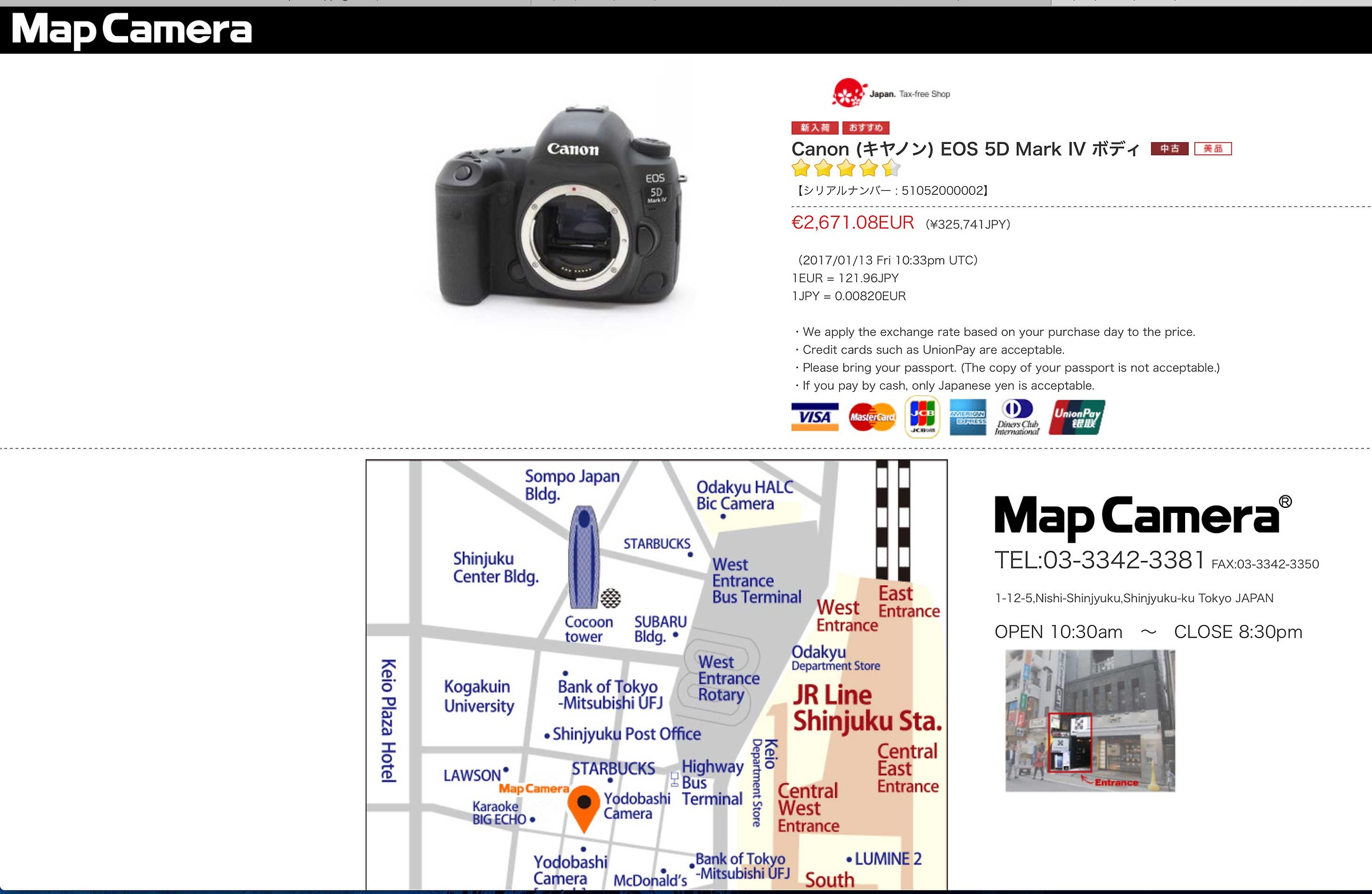Io la 5Dsr la presi qui, l'unico problema e' che hanno il menu solo in inglese e giapponese. Per il resto prezzo ottimo e negozio super affidabile (sono 5 piani solo di macchine fotografiche e obiettivi). Alcuni usati sono dalle mostre. Se non siete fichette risparmiate quasi 800 euro. Map Camera e' un punto di riferimento per i fotografi di tutto il Giappone e non solo. Si trova a Shinjuku a Tokyo. Ho fatto ottimi affari qui (300 f/2,8 L IS II and 500 f/4 L IS II) e altre lenti. Non me ne sono mai pentito. L'usato e' praticamente come nuovo e controllatissimo. Hanno un nome da difendere. Quando ho venduto qui la mia 5D mark III va in laboratorio e torni dopo 1 ora, e ti danno una valutazione. Prendere o lasciare. E' un po' come NOC in grande. search.mapcamera.com/?janCode=4549292075748&igngkeyword=1