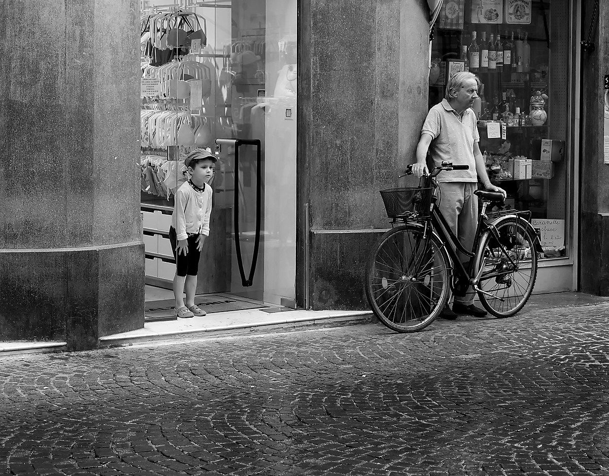 Improvviso temporale estivo: l'anziano ciclista si mette al riparo mentre la bimba si affaccia per vedere quanto piove
