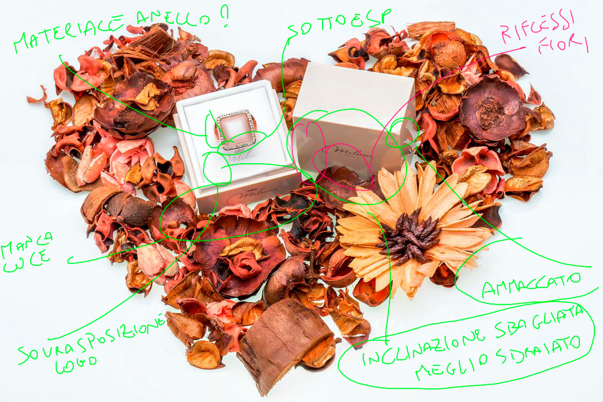 “ In che senso dalla bontà del flash utilizzato ? Per mia esperienza dipende dalla potenza del lampo. Più è potente meno blocca il movimento. „ Ogni Flash è diverso, la durata del lampo dipende molto anche dal tipo di flash utilizzato. Un Broncolor ed un Profoto naturalmente hanno durate molto diverse da un flash economico. Così come c'è differenza tra torcia e monotorcia, naturalmente la torcia avendo il generatore esterno è molto più potente e permette lampi velocissimi. Anche i costi sono decisamente diversi, nell'ordine di 20/30 a 1. “ SIcuramente hai dato ottimi spunti (bisogna proprio provocarti per farti parlare eh? :D) Credimi, nonlo faccio con cattiveria ma ho assolutamente voglia di imparare e portarmi avanti; Se tu dai i tuoi spunti senza essere meno "Nero" ma più grigio potresti dare una mano a tutti e sarebbe una cosa buona e utile nel forum. „ Sono discorsi interminabili da affrontare su un terreno come quello di un forum, peggio ancora se scritti. E' un pò come spiegare il sesso al telefono, di persona è un'altra cosa Comunque l'errore principale che si fa nello Still Life sta prima di tutto nella mancata osservazione. Non puoi pensare di posizionare le luci, sbeng e scattare. Si prende il prodotto in mano, si gira, si tocca, si sentono i materiali, si calcolano le grandezze, si analizza, e solo dopo si studia il modo di valorizzarlo. Valorizzarlo con una composizione, con una posa, con una comunicazione, con una luce. Ecco, questo passaggio a te manca completamente, ed è il primo di una lunga lista quando affronti uno scatto di qualsiasi natura, in studio. Il vetro si comporta in un modo, l'acciaio in un altro, l'acciaio opaco, lucido, la plastica, le sfaccettature, capire quali sono gli elementi da valorizzare, come lucidare/pulire determinati materiali, tutto di tutto. Manca tutto. Quindi prima di passare alla composizione, alle luci, alla comunicazione, alla post produzione etc etc, devi cercare di partire dalla prima fase, che è quella che ti ho descritto sopra. La foto che hai postato è assente di tutti i concetti fondamentali relativi alla valorizzazione del prodotto. 1 - Perchè hai fotografato le scatole? Le scatole/packaging si fotografano solo quando sono BELLE e costose. Se sono scatolacce, non si fotografano. Tu vendi il prodotto, non la scatola. 30 anni fa si facevano le foto alle confezioni, non oggi, non con confezioni così basic. Se fosse stata una confezione in acciaio, in legno pregiato o altro, avrebbe avuto un senso diverso. E se te lo chiede il committente, ci discuti. Un fotografo studia le mode del momento, le altre aziende competitor, e solo dopo realizza un mood. Comunque anche come le hai posizionate non ha una logica, se avessi disteso la confezione sulla destra sarebbe stato molto meglio. 2 - Mi stai vendendo un anello, e l'anello me lo metti dentro la confezione? E io che vedo? Come faccio a capire l'anello di che materiale è? Oro? Plastica? Argento? Ottone? Cioè stai vendendo un anello e non mi fai vedere il materiale. Sono errori concettuali talmente grandi che non ti faranno mai vendere il prodotto, e se fai commerciale prima ancora di essere un fotografo, devi essere un venditore. Le aziende si affidano a noi fotografi anche nelle consulenze di immagine. 3 - 4 - 5 - Li lascio vuoti, ci sta troppo da scrivere e sto in pausa Ti lascio due piccole cose scritte da tenere a mente e da valutare quando gestisci la luce, sono cose tecniche.