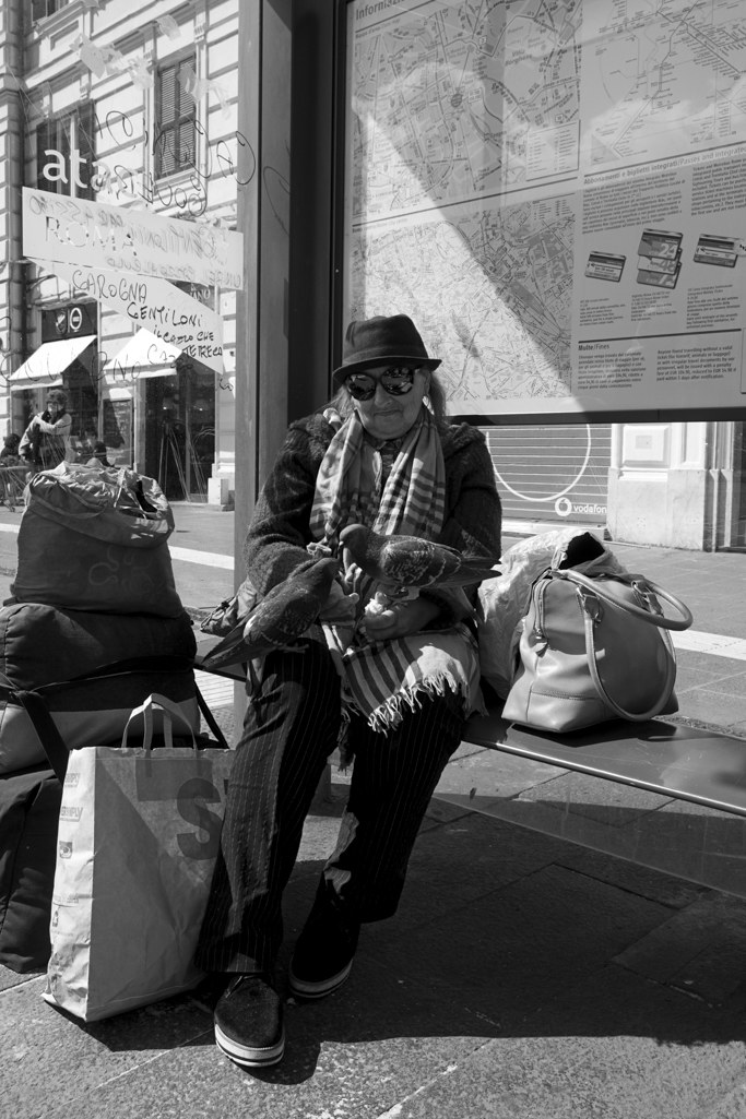 Da dietro avrei perso il suo rapporto con i piccioni ma l'alterazione, anche se minima, della realtà mi ha consentito di stingere un rapporto con lei, l'ho incontrata tempo dopo e h chiacchierato un po' con lei e ho potuto farle un'altra foto dove lei è chiaramente in posa ma non credo sia meno forte della prima sono solo due foto diverse e per me entrambe "street" solo con diversi livelli di alterazione della realtà. Mi piace come sis ta sviluppando questo confronto di idee