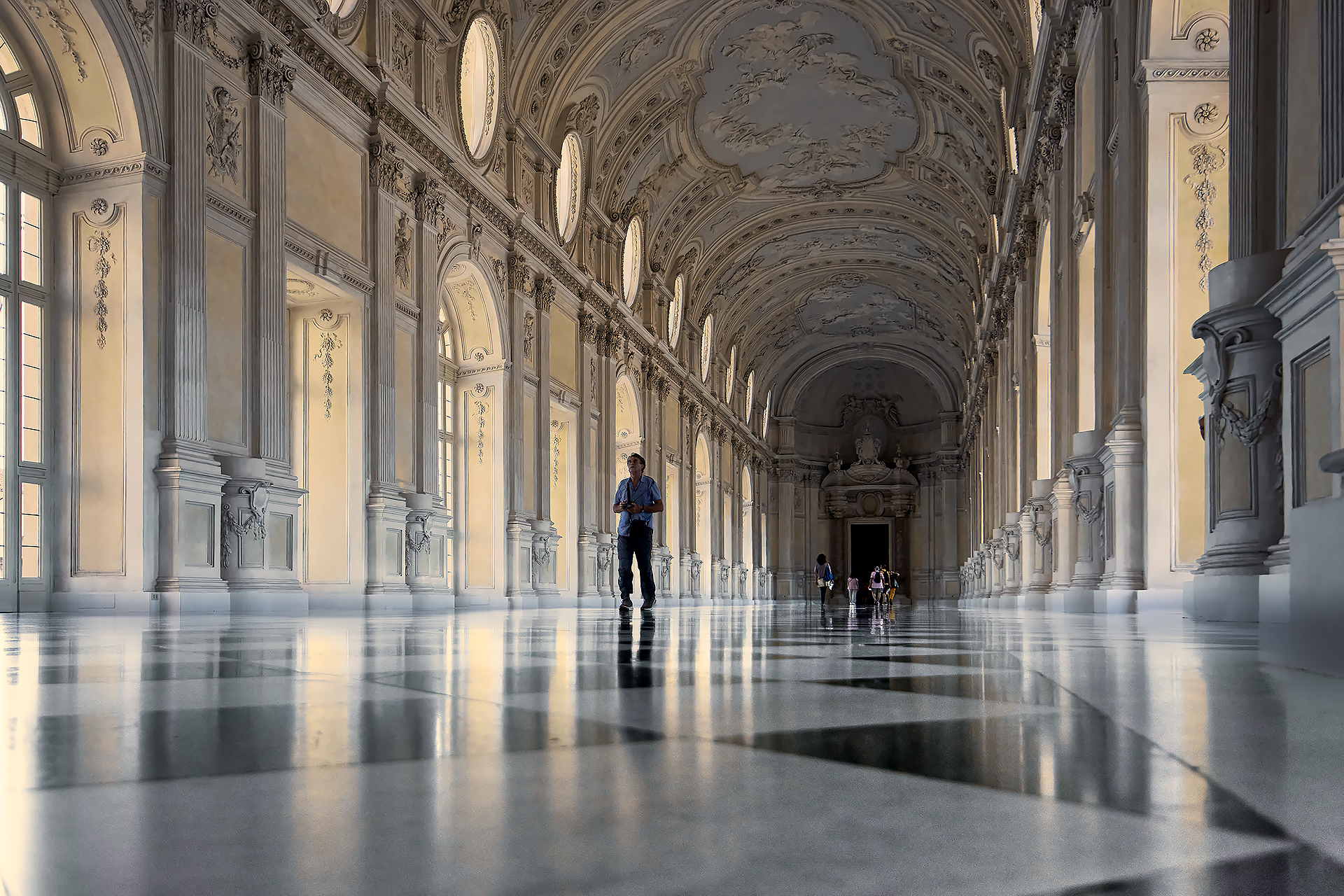 ciao, ci provo! quando ho visto il raw mi è subito piaciuto il contrasto tra la temperatura di colore del pavimento con il resto dell'ambiente e quindi ho cercato di enfatizzare questo aspetto come anche il riflesso sul magnifico pavimento che enfatizza la via di fuga, non ho eliminato le persone perchè raccontano una storia di questa nobile dimora, bello il contrasto tra il fotografo e i visitatori che ormai lasciano la sala - un altro contrasto tra chi semplicemente vede ciò che lo circonda e chi invece si sofferma a guardare.